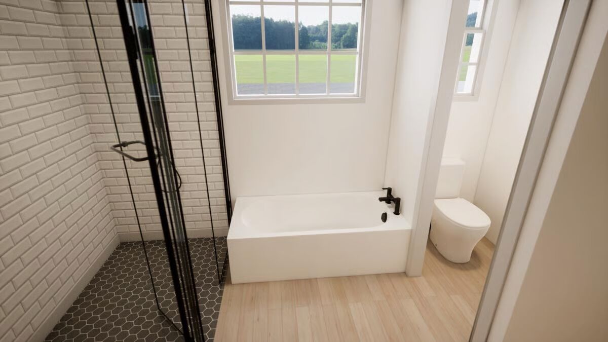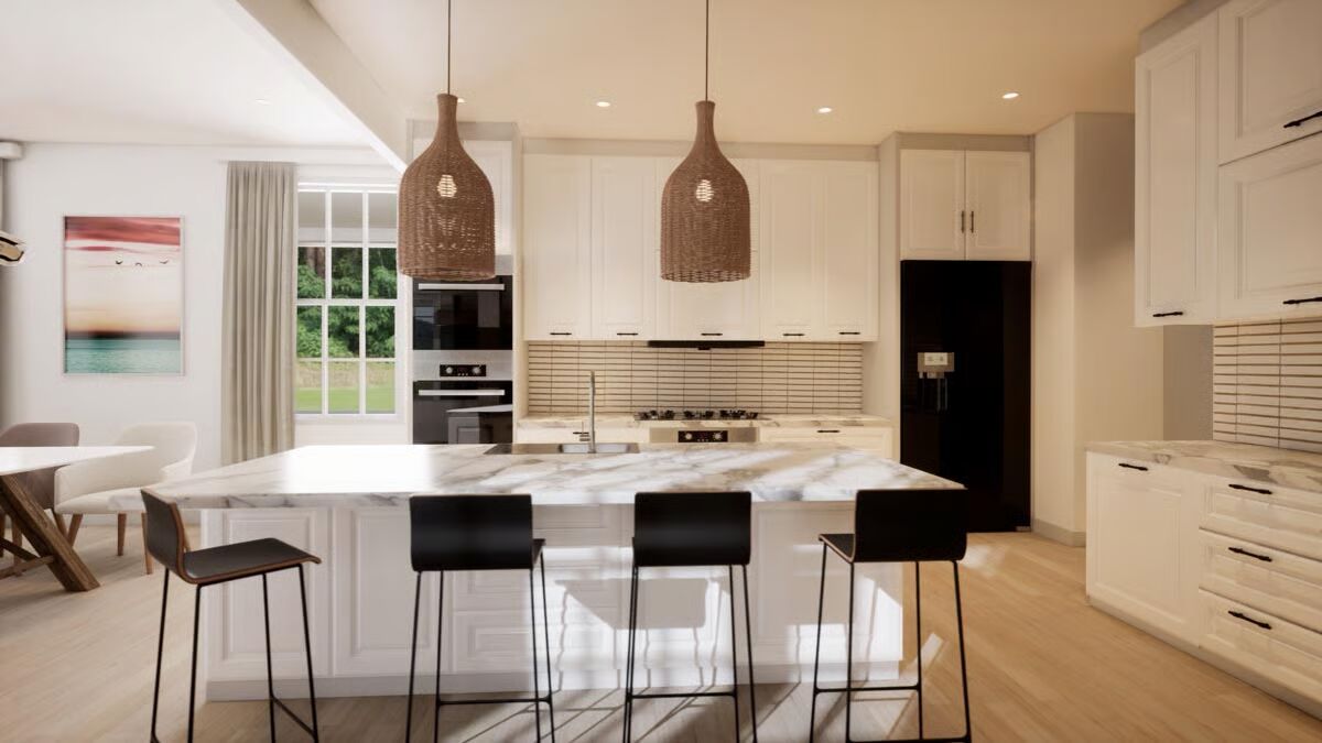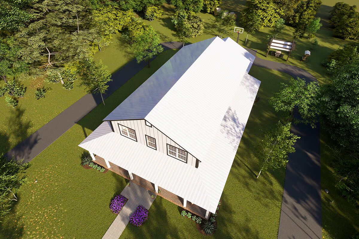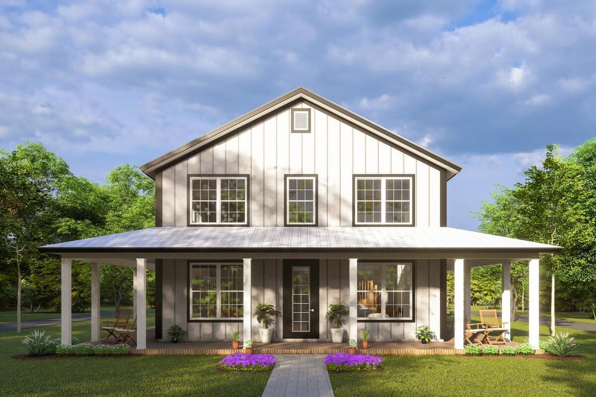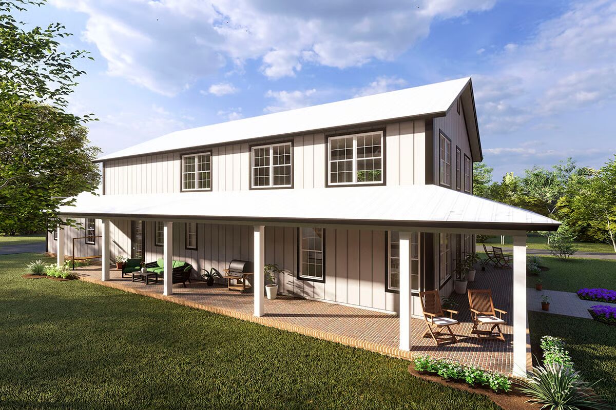 This 4-bedroom, 3.5-bath barndominium plan offers 2,761 sq. ft. of heated living space, designed with durable 2×6 exterior walls. A spacious 808 sq. ft. 3-car garage with workshop space and a 7’-deep wraparound porch add both functionality and charm.