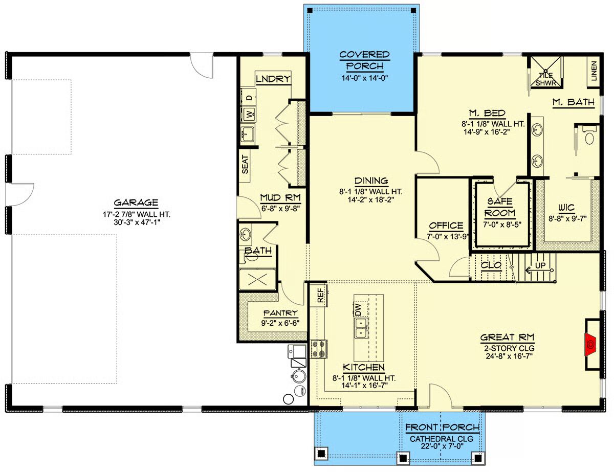 The main-level primary suite features a private 4-fixture bath, walk-in closet, and direct access to a 7′ x 8’5″ safe room for peace of mind.