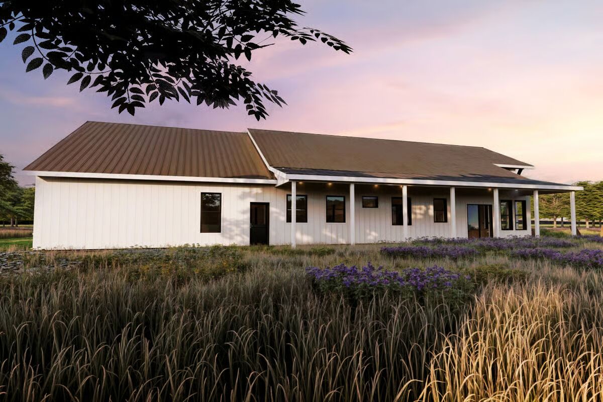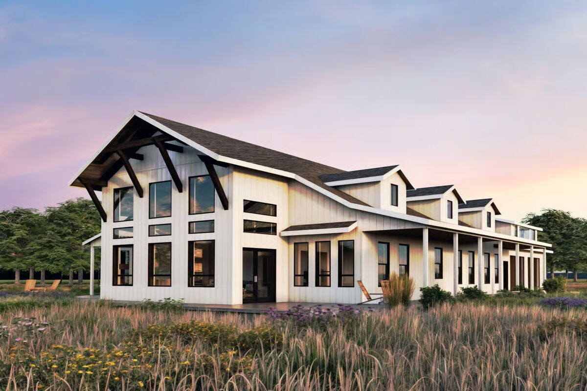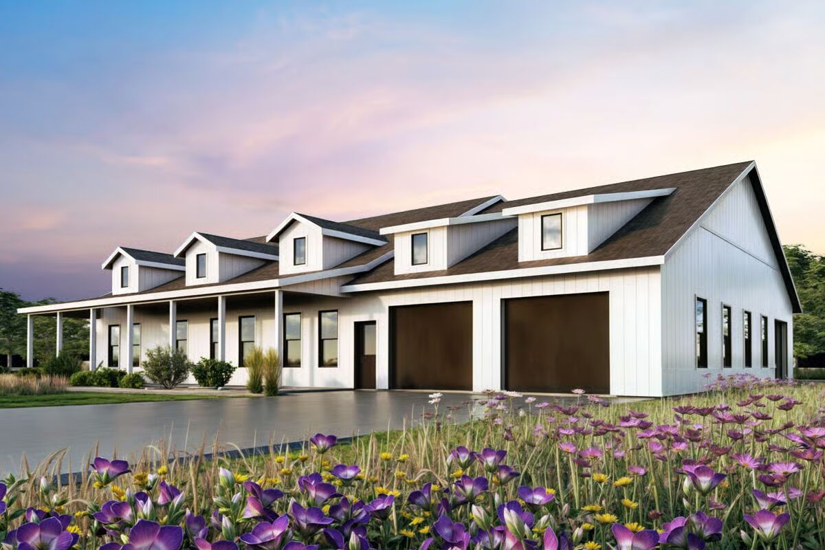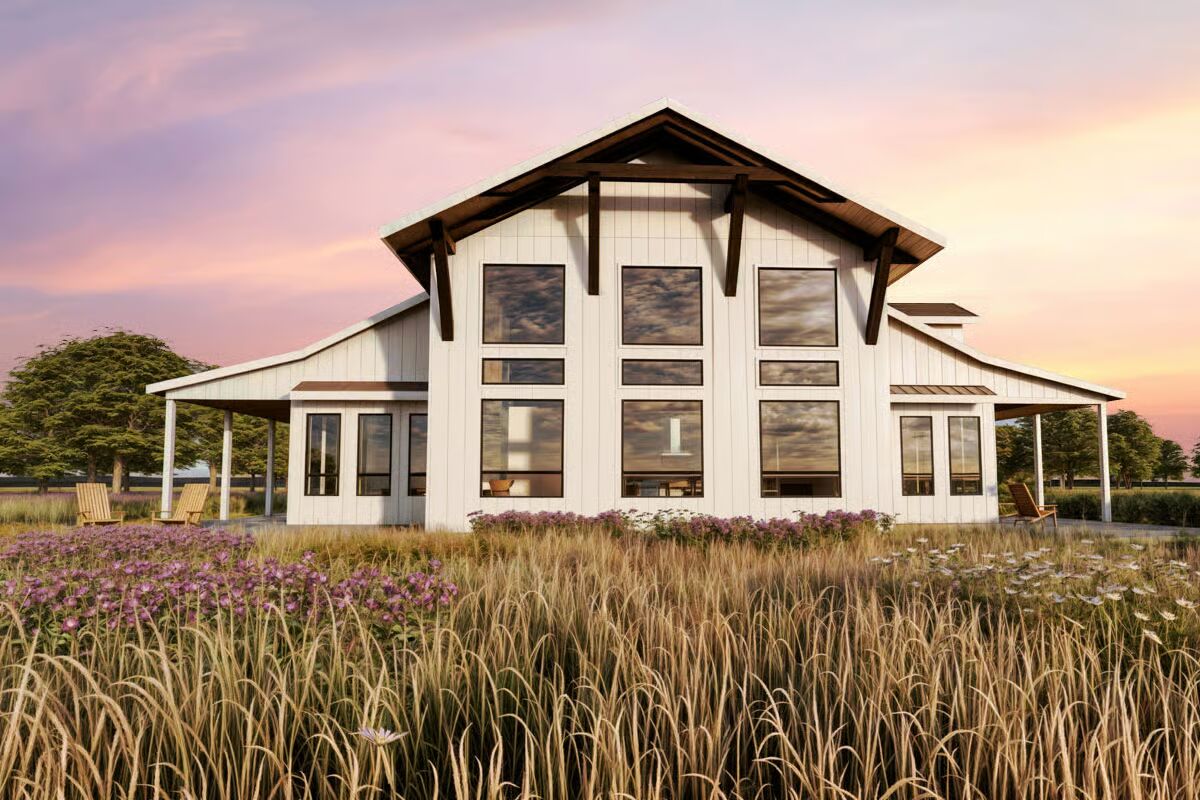 Buy This PlanThis grand barndominium facade welcomes you with classic dormers, a covered porch, and dual garage bays, set against a stunning sunset and a field of purple wildflowers.The towering rear elevation of this home features a stunning, symmetric wall of windows, bringing the beautiful countryside right into the main living space.This striking side profile highlights the dramatic sloping roofline and a multitude of expansive windows, beautifully framed by a serene wildflower meadow.Enjoy the simplicity of country living on the long, covered porch of this barndominium, sheltered under a deep brown metal roof.A perfect blend of style and utility, this long-view showcases the home’s attached garage bays and multiple dormers under a picturesque sky.The dynamic roofline and bold black trim create a modern farmhouse aesthetic on this impressive barndominium, beckoning you to its covered entryway.Natural light floods the open-concept living and dining area through magnificent two-story windows, offering spectacular views in every direction.From the oversized kitchen island, you can take in the entire great room, where the tall stone fireplace anchors the stylish, sun-drenched space.The chef’s kitchen impresses with rich wood cabinetry, a huge marble island, and soaring ceilings that connect it visually to the upstairs loft.Culinary dreams come to life in this beautifully appointed kitchen, where modern appliances meet timeless design and ample counter space.The living room is a masterpiece of design, featuring a floor-to-ceiling stone fireplace and a stunning arrangement of windows that celebrate the light.This bright, upper-level loft provides a cozy, private escape with an elevated view of the main floor and an angled ceiling that adds architectural interest.Wake up surrounded by nature in this tranquil primary bedroom, where large corner windows provide a continuous, breathtaking view of the landscape.