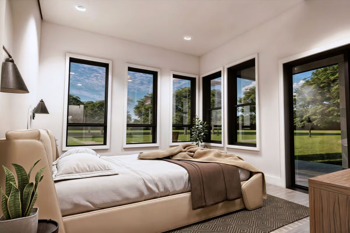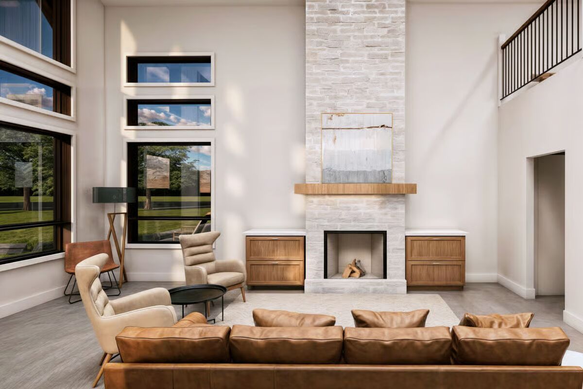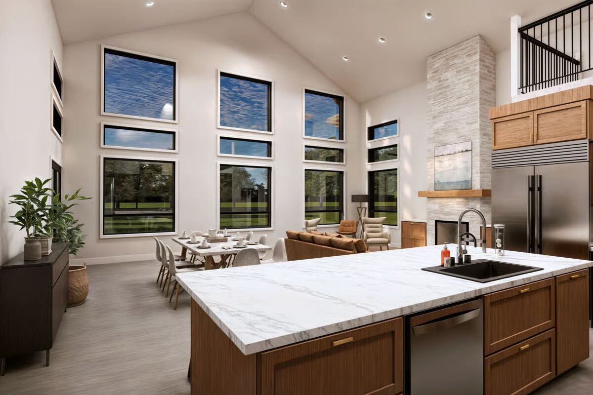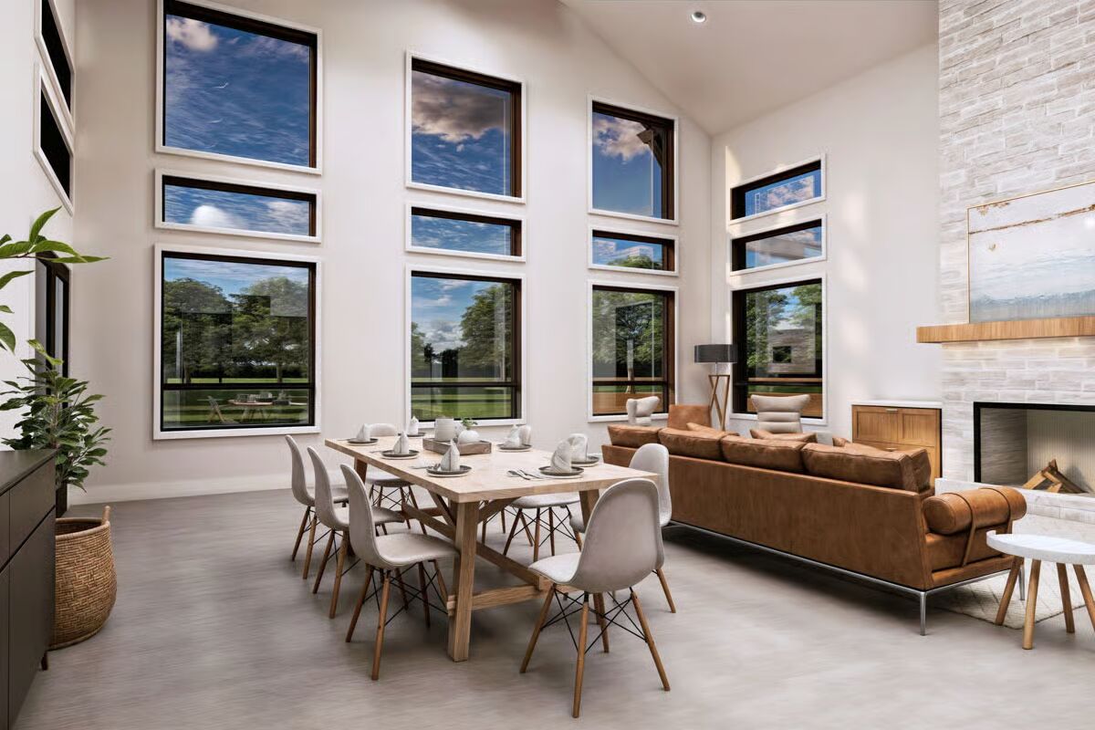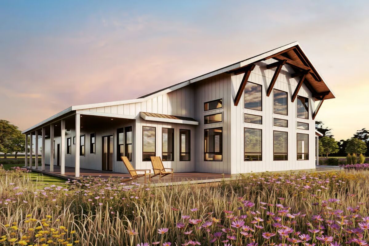 Buy This PlanThis grand barndominium facade welcomes you with classic dormers, a covered porch, and dual garage bays, set against a stunning sunset and a field of purple wildflowers.The towering rear elevation of this home features a stunning, symmetric wall of windows, bringing the beautiful countryside right into the main living space.This striking side profile highlights the dramatic sloping roofline and a multitude of expansive windows, beautifully framed by a serene wildflower meadow.Enjoy the simplicity of country living on the long, covered porch of this barndominium, sheltered under a deep brown metal roof.A perfect blend of style and utility, this long-view showcases the home’s attached garage bays and multiple dormers under a picturesque sky.The dynamic roofline and bold black trim create a modern farmhouse aesthetic on this impressive barndominium, beckoning you to its covered entryway.Natural light floods the open-concept living and dining area through magnificent two-story windows, offering spectacular views in every direction.From the oversized kitchen island, you can take in the entire great room, where the tall stone fireplace anchors the stylish, sun-drenched space.The chef’s kitchen impresses with rich wood cabinetry, a huge marble island, and soaring ceilings that connect it visually to the upstairs loft.Culinary dreams come to life in this beautifully appointed kitchen, where modern appliances meet timeless design and ample counter space.The living room is a masterpiece of design, featuring a floor-to-ceiling stone fireplace and a stunning arrangement of windows that celebrate the light.This bright, upper-level loft provides a cozy, private escape with an elevated view of the main floor and an angled ceiling that adds architectural interest.Wake up surrounded by nature in this tranquil primary bedroom, where large corner windows provide a continuous, breathtaking view of the landscape.