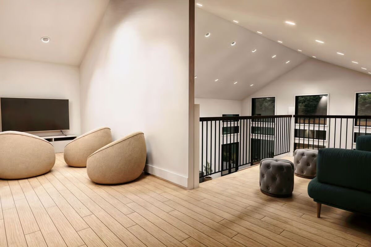 A versatile loft overlooks the main living space, adding flexibility for a media room, office, or lounge.