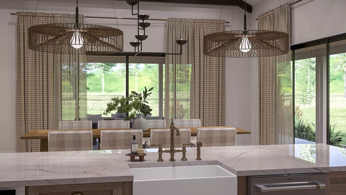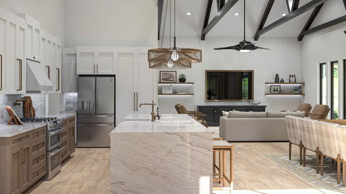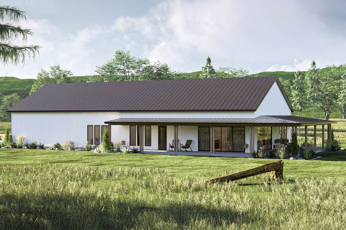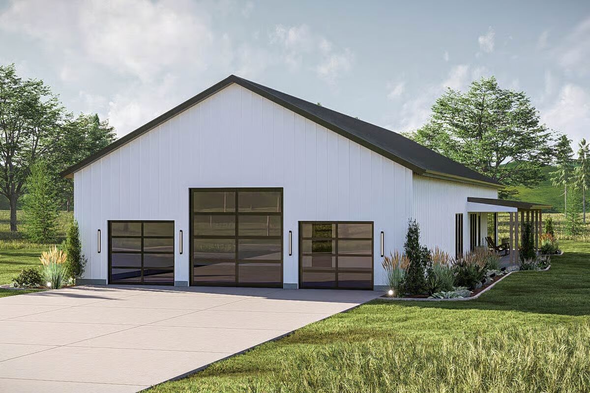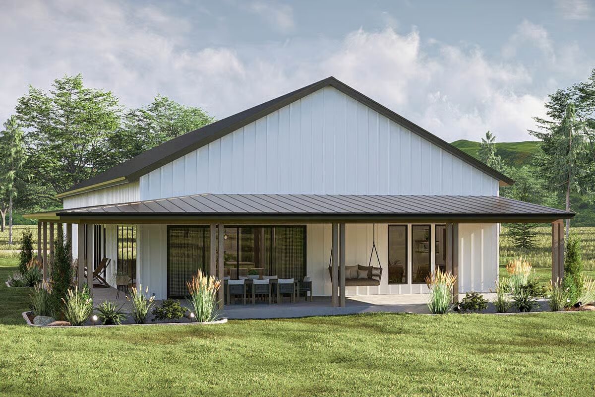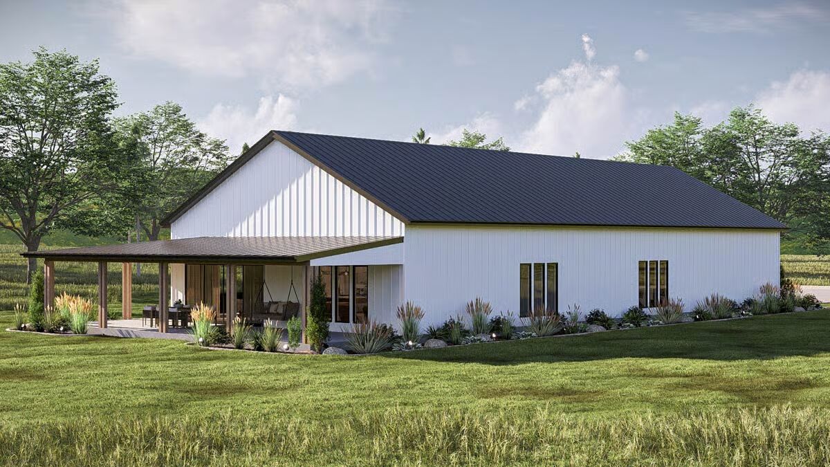 Buy This PlanThis Barndominium stands elegantly in a grassy field, featuring a dark metal roof and an inviting, full-length covered porch.The dramatic Barndominium facade features a crisp white exterior and modern, multi-pane glass garage doors for a contemporary look.A view of the Barndominium’s expansive side highlights its simple, vertical siding and large covered patio that extends into the landscape.The wide back porch of the Barndominium offers a perfect blend of indoor-outdoor living with a covered dining area and a swinging bench.A sun-drenched, covered patio creates a warm, relaxing outdoor space against the Barndominium’s clean, modern lines.The elegant dining room is bathed in natural light, showcasing a solid wood table and checked plaid chairs with tall windows.A spectacular great room seamlessly blends the kitchen, dining, and living areas under a soaring vaulted ceiling with dark accents.A close-up reveals the stunning kitchen design with a bright tiled backsplash, white cabinetry, and eye-catching woven pendant lights above the island.Floor-to-ceiling glass doors surround this stylish dining area, offering beautiful views and direct access to the outdoor patio.High ceilings with exposed dark beams enhance this comfortable living space, featuring a modern fan and floor-to-ceiling windows.This chic and cozy living room features a minimalist design with comfortable seating and elegant floating shelves flanking a mounted television.This bright kitchen features a large marble-top island, a built-in refrigerator column, and contemporary wooden bar stools.A wide-angle view showcases the open kitchen and living area, highlighting the high ceilings and elegant mix of wood and white finishes.The pristine white cabinetry and marble countertops create a clean, classic aesthetic in this modern and functional kitchen.A view over the kitchen sink provides a glimpse of the sophisticated dining area, framed by checked curtains and large windows.The serene primary bedroom creates a relaxing retreat with a dark accent wall, natural wood nightstands, and a sophisticated leather bench.A spacious double vanity features a long marble countertop, rich wood cabinetry, and sleek brass wall sconces against a white subway tile wall.