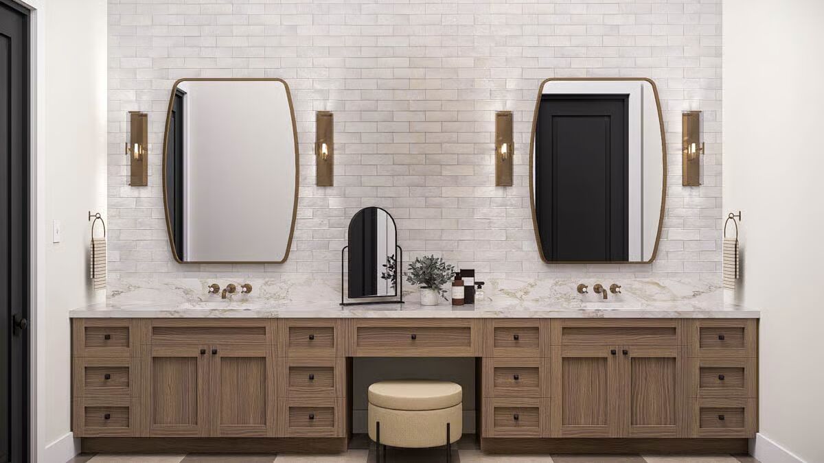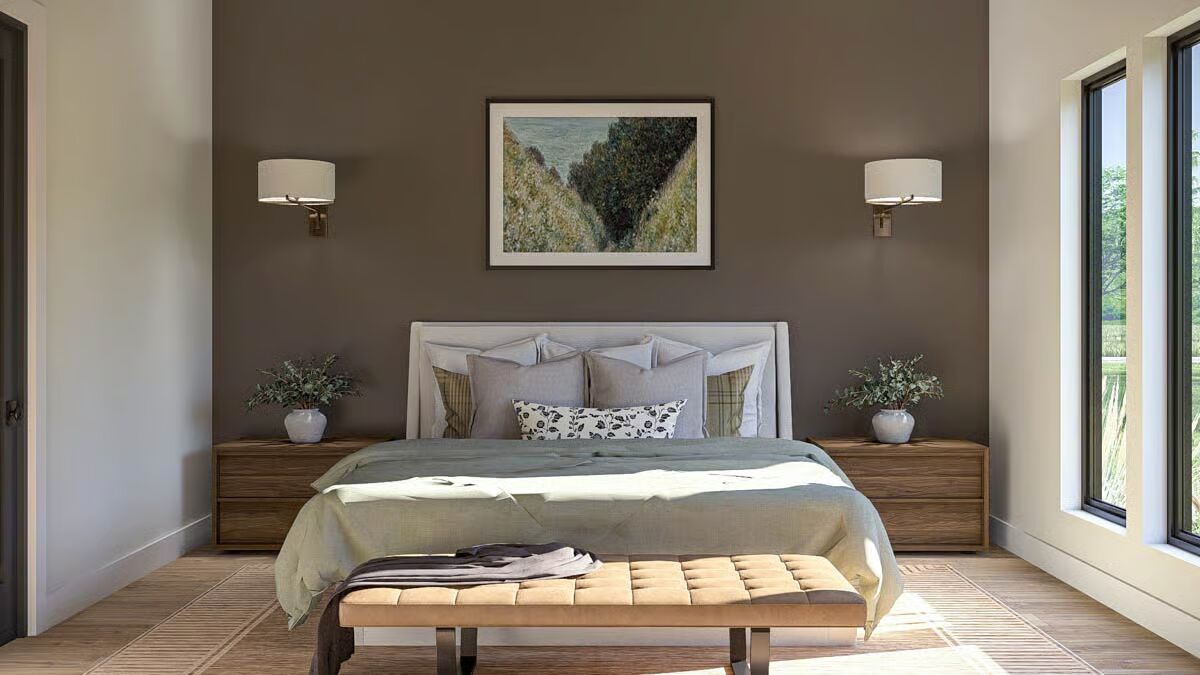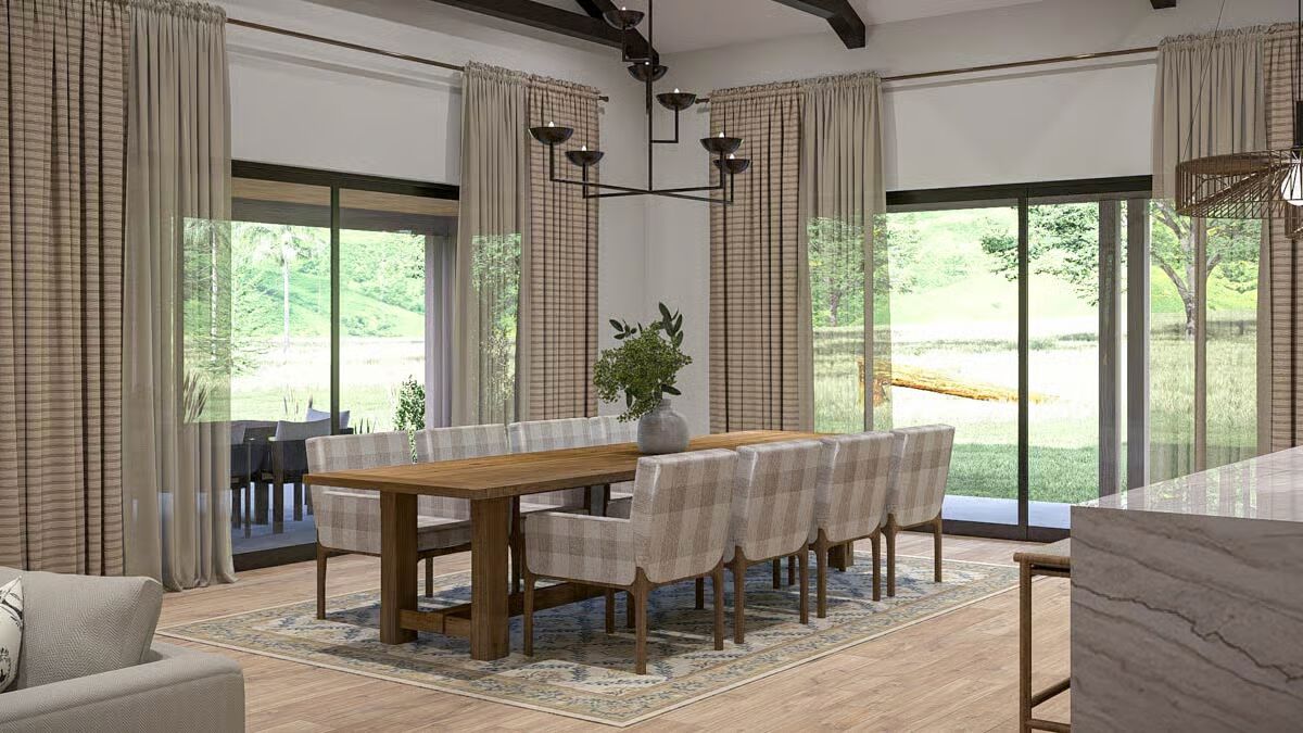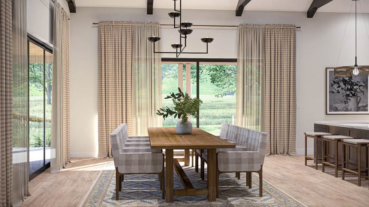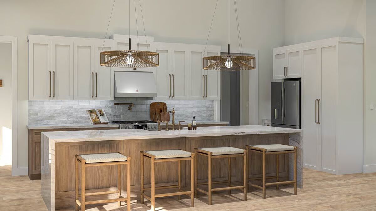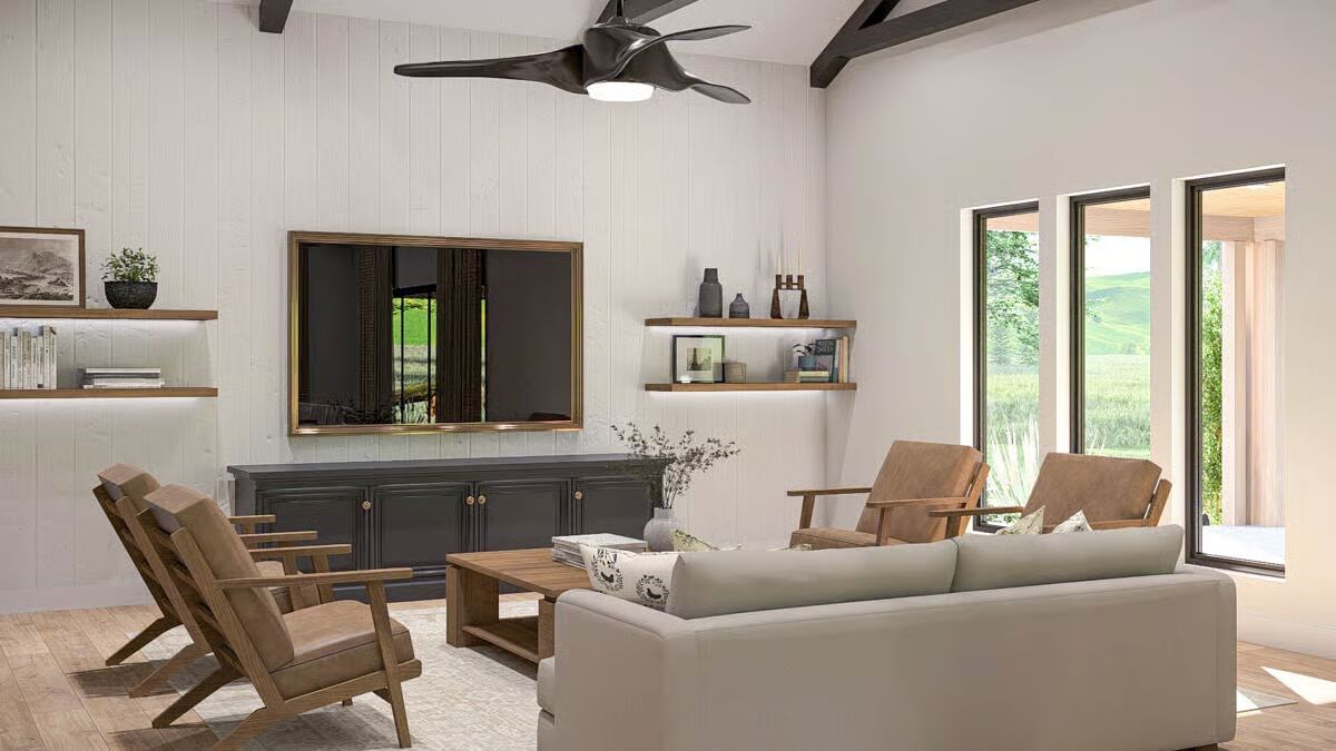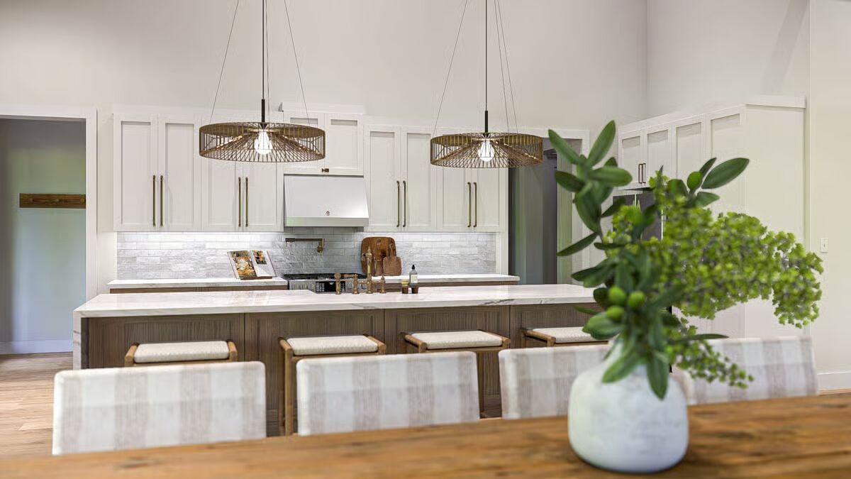 Buy This PlanThis Barndominium stands elegantly in a grassy field, featuring a dark metal roof and an inviting, full-length covered porch.The dramatic Barndominium facade features a crisp white exterior and modern, multi-pane glass garage doors for a contemporary look.A view of the Barndominium’s expansive side highlights its simple, vertical siding and large covered patio that extends into the landscape.The wide back porch of the Barndominium offers a perfect blend of indoor-outdoor living with a covered dining area and a swinging bench.A sun-drenched, covered patio creates a warm, relaxing outdoor space against the Barndominium’s clean, modern lines.The elegant dining room is bathed in natural light, showcasing a solid wood table and checked plaid chairs with tall windows.A spectacular great room seamlessly blends the kitchen, dining, and living areas under a soaring vaulted ceiling with dark accents.A close-up reveals the stunning kitchen design with a bright tiled backsplash, white cabinetry, and eye-catching woven pendant lights above the island.Floor-to-ceiling glass doors surround this stylish dining area, offering beautiful views and direct access to the outdoor patio.High ceilings with exposed dark beams enhance this comfortable living space, featuring a modern fan and floor-to-ceiling windows.This chic and cozy living room features a minimalist design with comfortable seating and elegant floating shelves flanking a mounted television.This bright kitchen features a large marble-top island, a built-in refrigerator column, and contemporary wooden bar stools.A wide-angle view showcases the open kitchen and living area, highlighting the high ceilings and elegant mix of wood and white finishes.The pristine white cabinetry and marble countertops create a clean, classic aesthetic in this modern and functional kitchen.A view over the kitchen sink provides a glimpse of the sophisticated dining area, framed by checked curtains and large windows.The serene primary bedroom creates a relaxing retreat with a dark accent wall, natural wood nightstands, and a sophisticated leather bench.A spacious double vanity features a long marble countertop, rich wood cabinetry, and sleek brass wall sconces against a white subway tile wall.