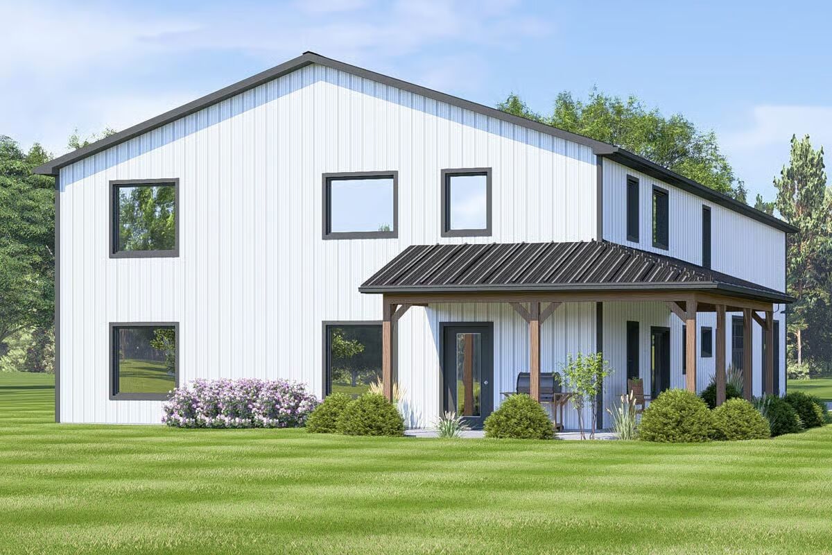 This barndominium-style home features an efficient, budget-friendly rectangular design paired with a wraparound front porch that offers dual entry points and inviting outdoor living.