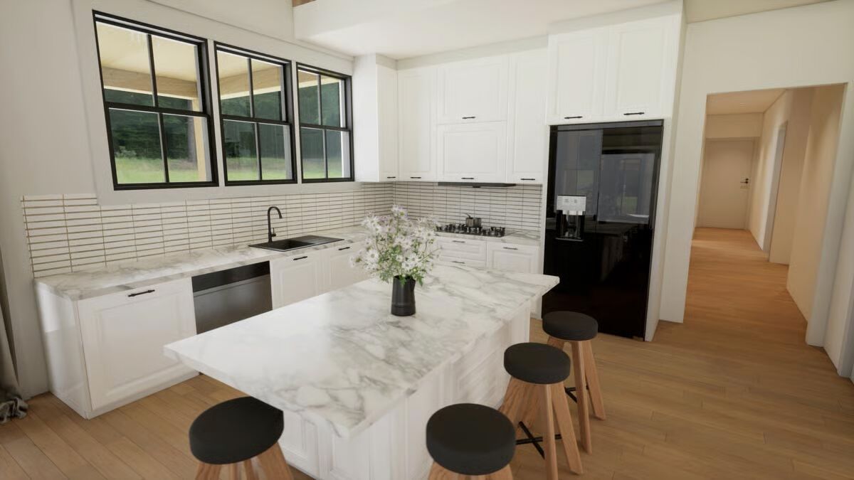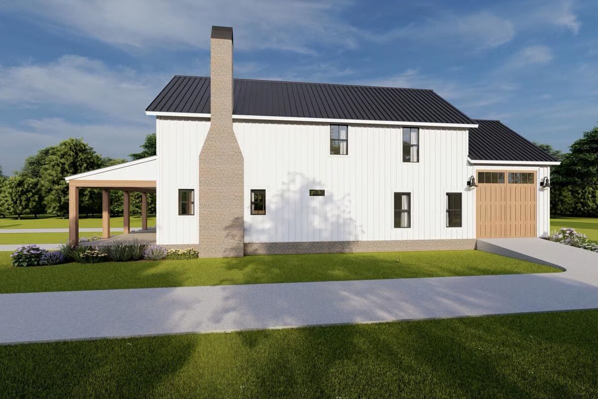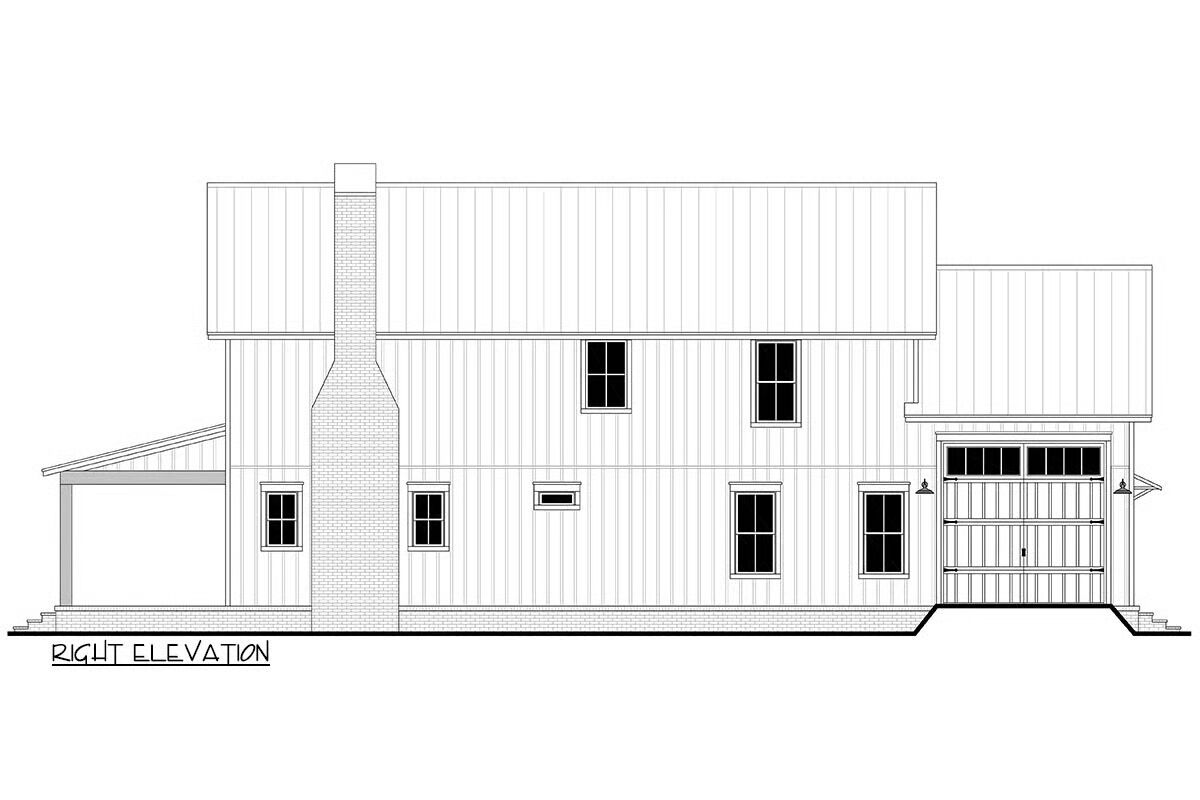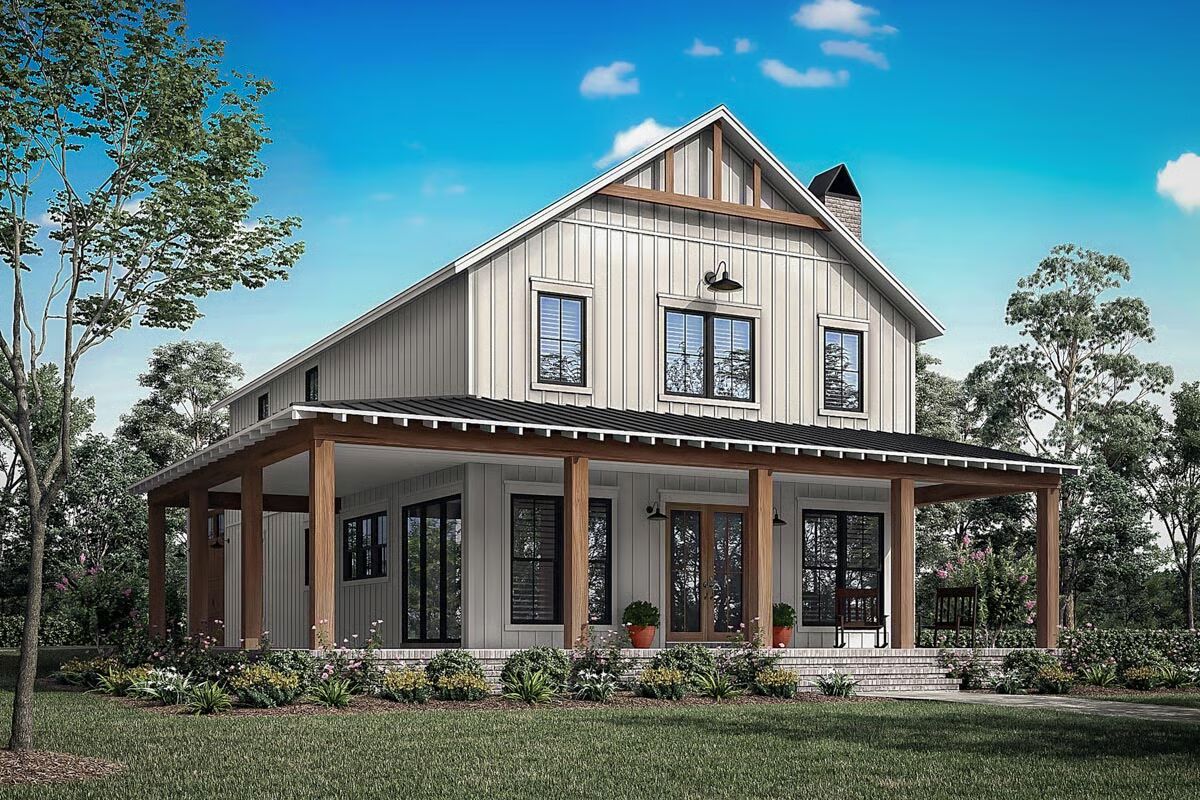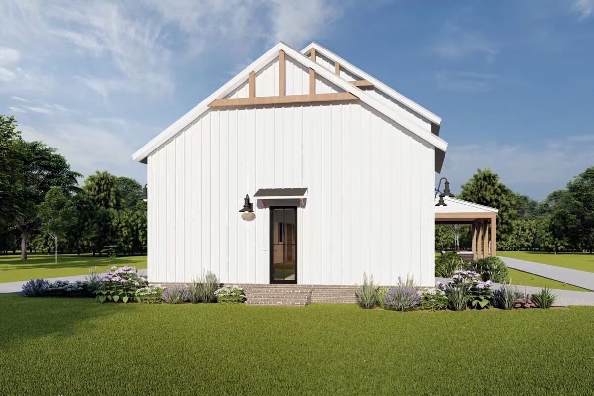 This two-story barndominium-style home offers 2,417 sq. ft. of living space with 4 bedrooms and 3 bathrooms, thoughtfully designed with conventional wood framing and 2×6 exterior walls.