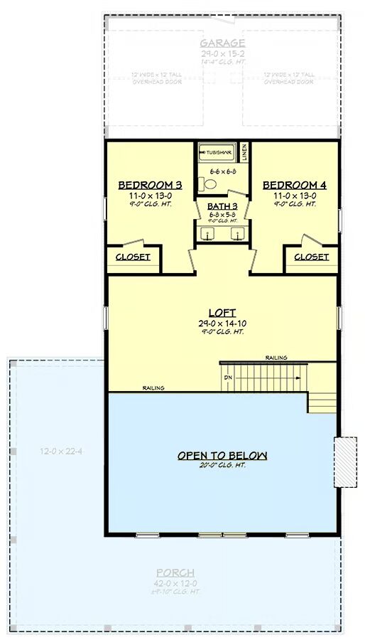 A corner wraparound porch welcomes you inside to an open-concept great room, dining area, and L-shaped kitchen beneath a soaring 20′ two-story ceiling.