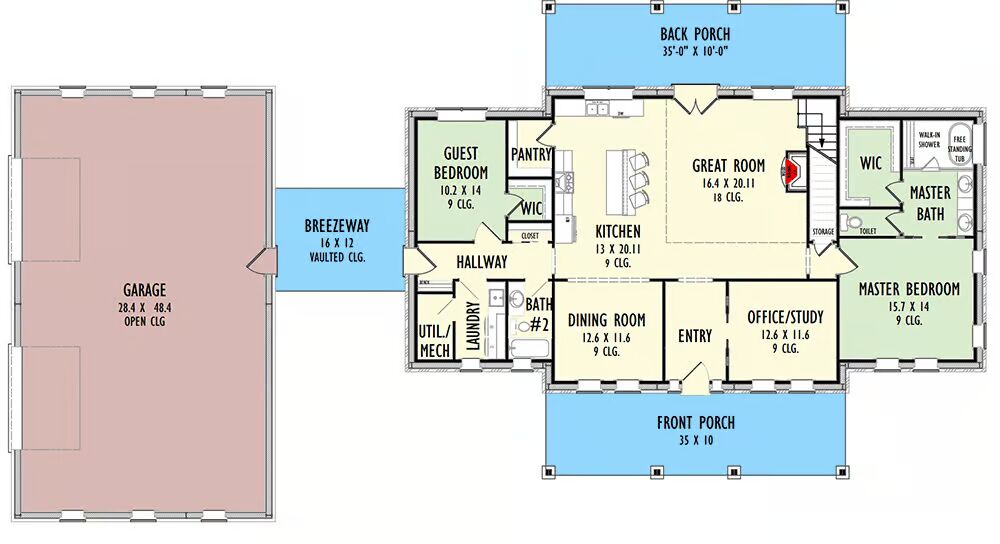 The main-level master suite spans the entire right wing of the home, featuring a generous walk-in closet and a luxurious 5-fixture bath. On the opposite side, a guest bedroom with walk-in closet enjoys convenient access to a full hall bath.