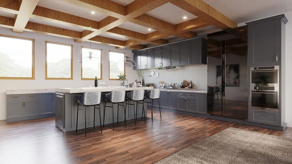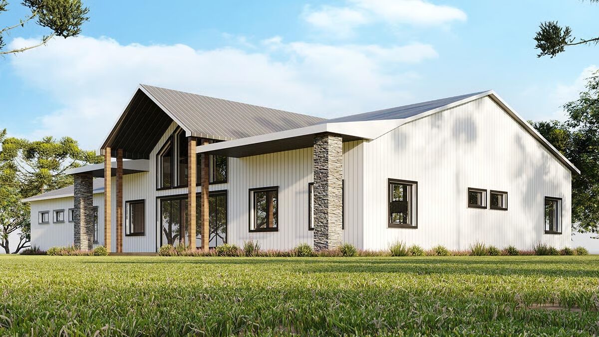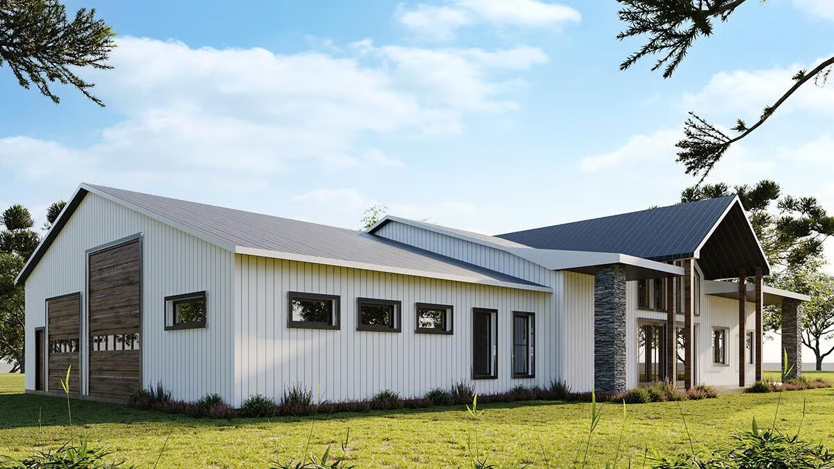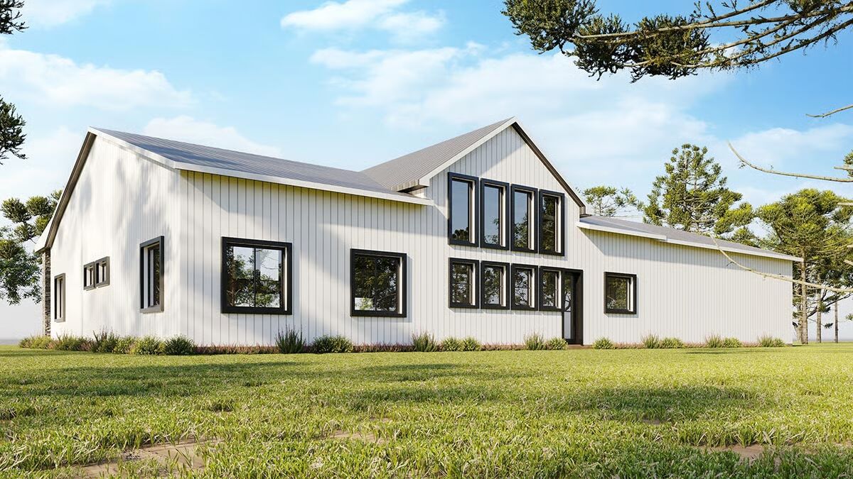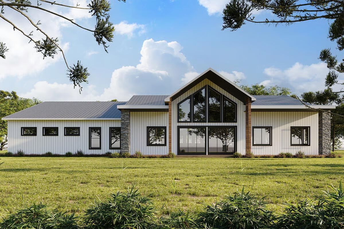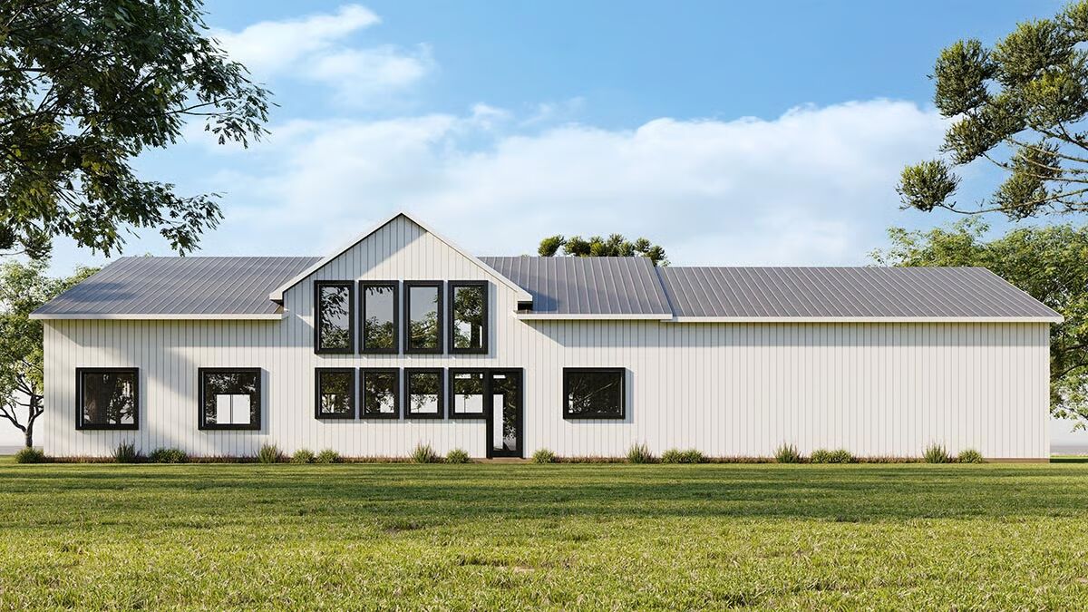 This barndominium-style house plan delivers 3,265 square feet of heated living space with a thoughtful, accessible design throughout, including 36″ doors for full ADA compliance.