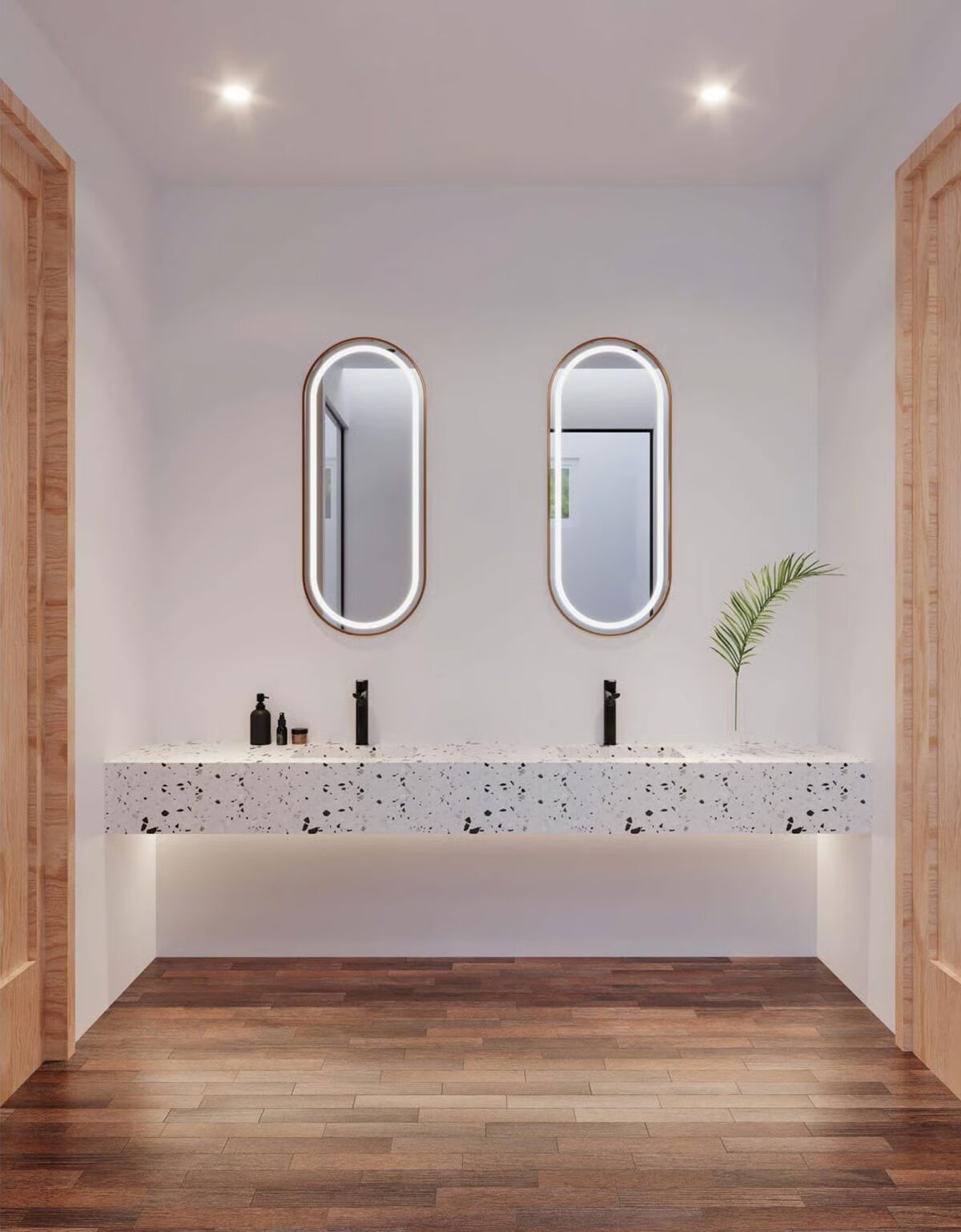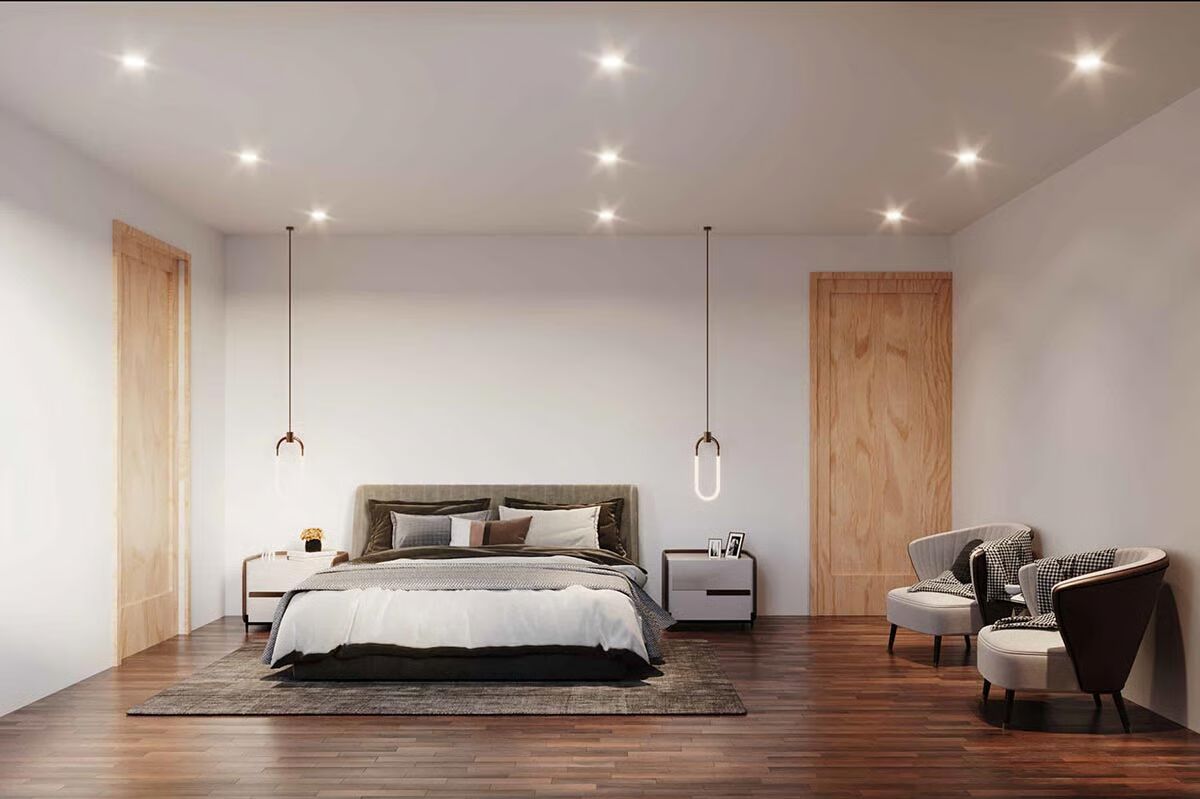 The private master suite, set apart on the left wing for maximum privacy, includes dual vanities, a two-person shower, and an expansive walk-in closet. On the opposite side, four guest bedrooms are thoughtfully arranged in pairs, each sharing a convenient Jack-and-Jill-style bathroom.