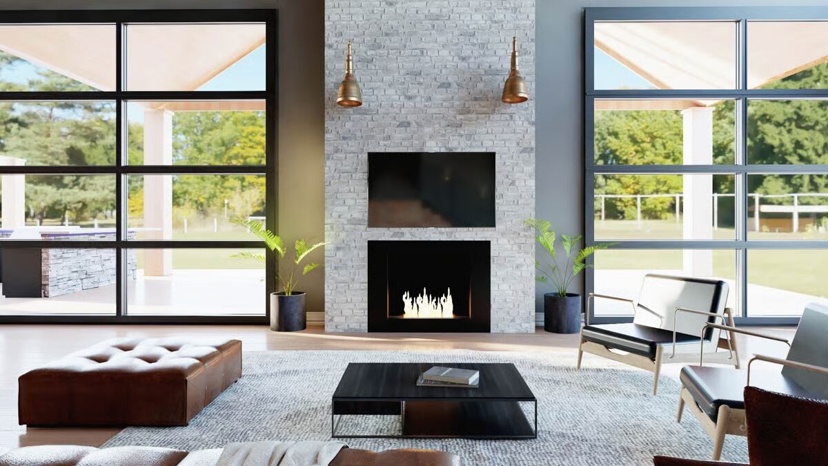 The living room itself is framed by matching 12′ x 12′ overhead doors, further extending the connection to the outdoors.