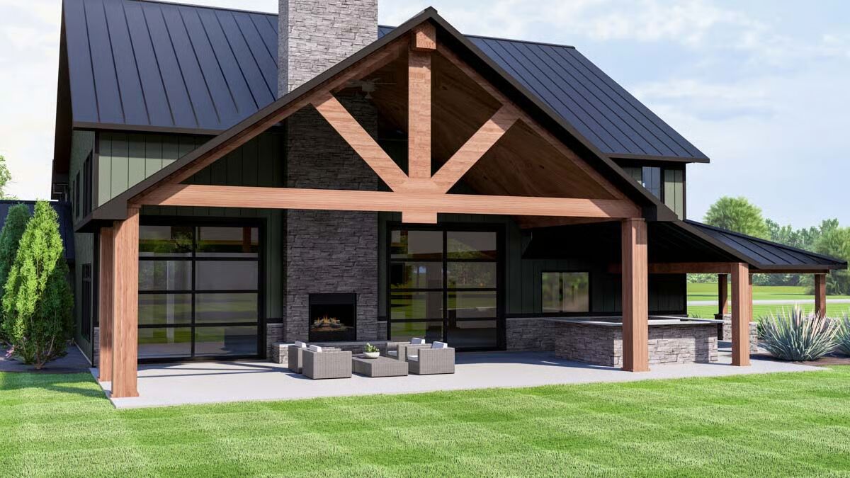 A wraparound porch spanning three sides enhances the home’s charm, while an outdoor kitchen and a striking two-sided fireplace—shared with the great room—create seamless indoor-outdoor living.