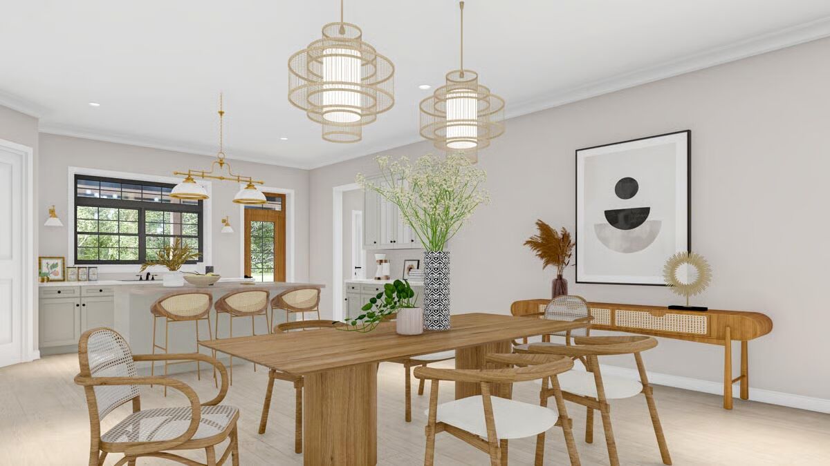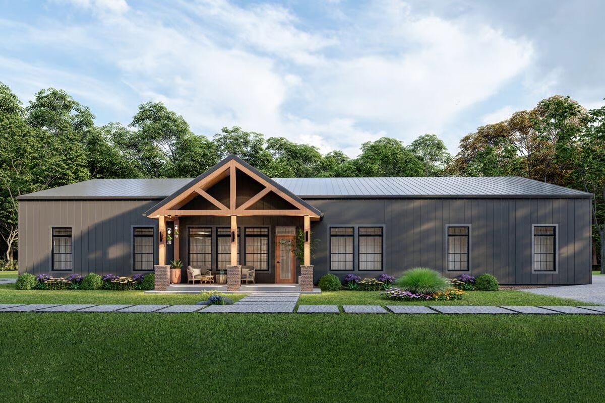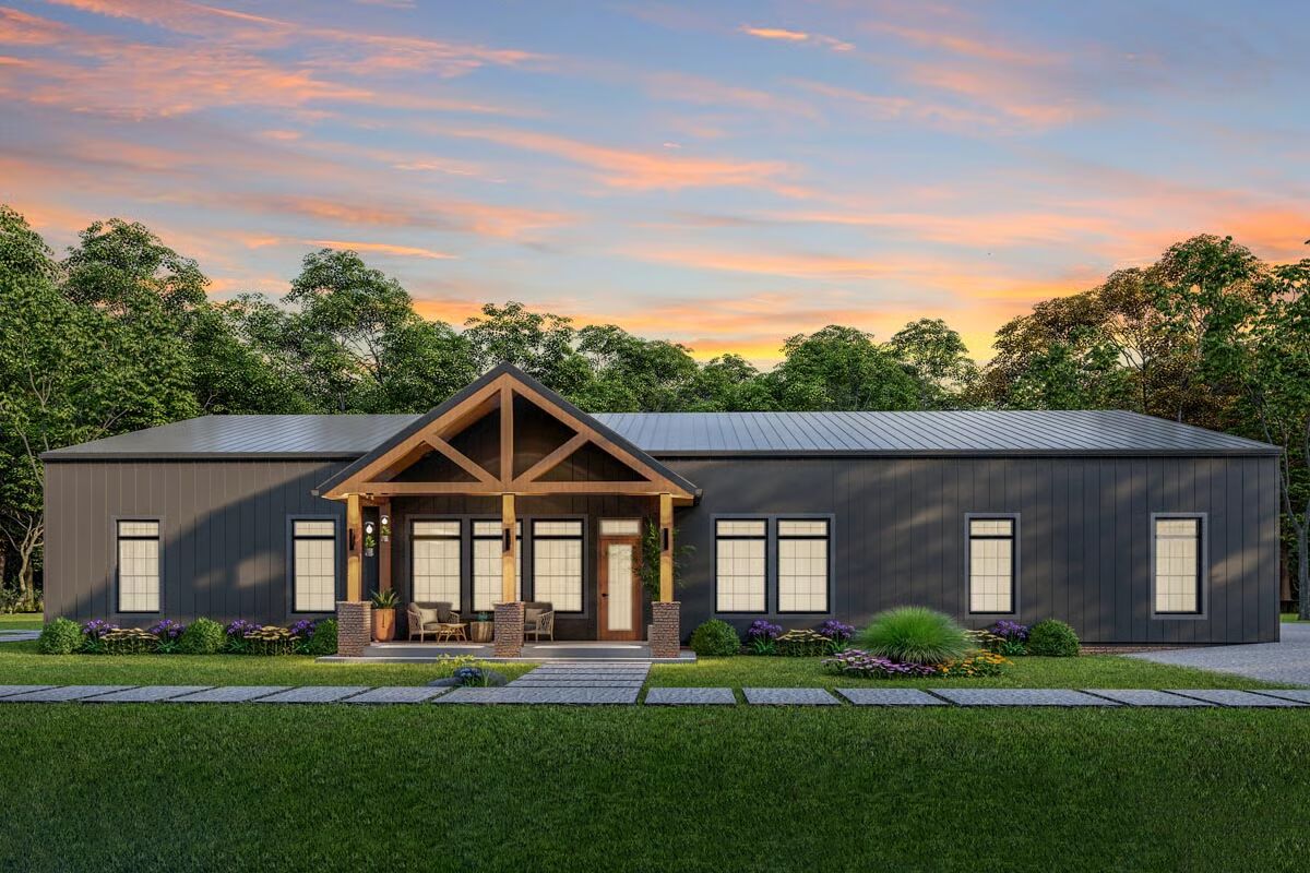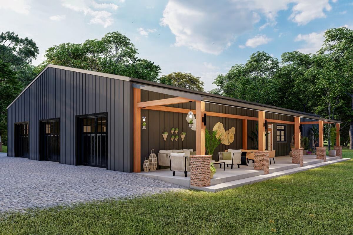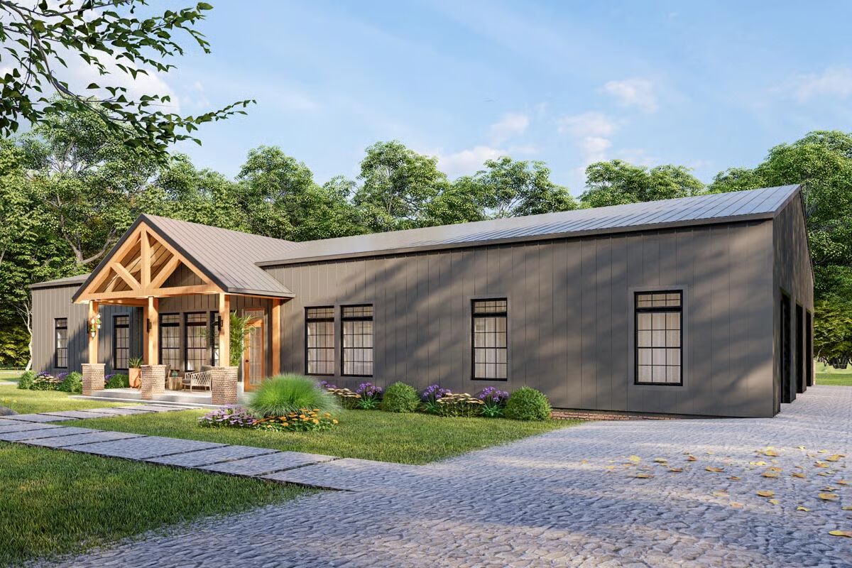 This 2,800 sq. ft. barndominium-inspired residence combines farmhouse warmth with an industrial edge, highlighted by vertical siding, a durable metal roof, striking timber trusses, and expansive multi-pane windows.