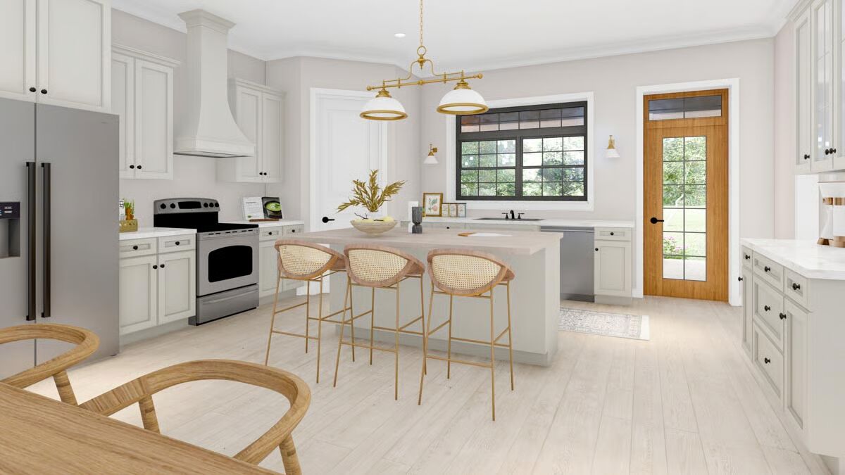 A kitchen window above the sink offers a charming view of the 12’-deep rear porch—perfect for indoor-outdoor living.