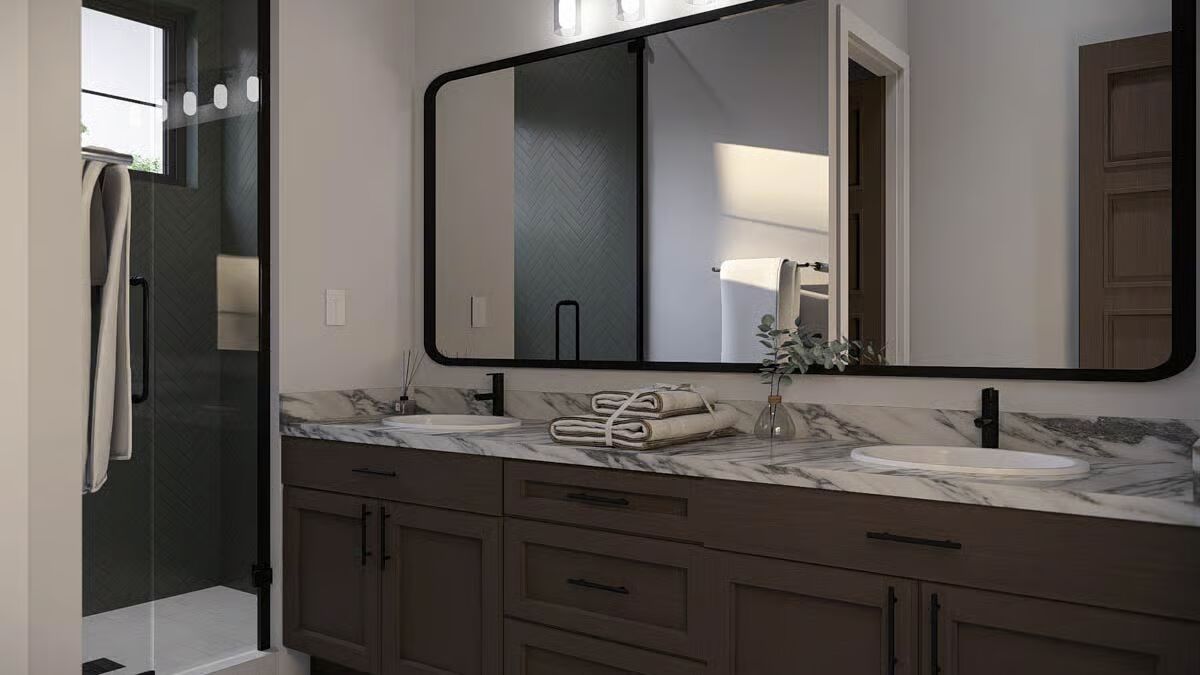 The private master suite is thoughtfully positioned away from the secondary bedrooms, offering a tranquil retreat with its own sloped ceiling, spa-inspired bath, and walk-in closet.