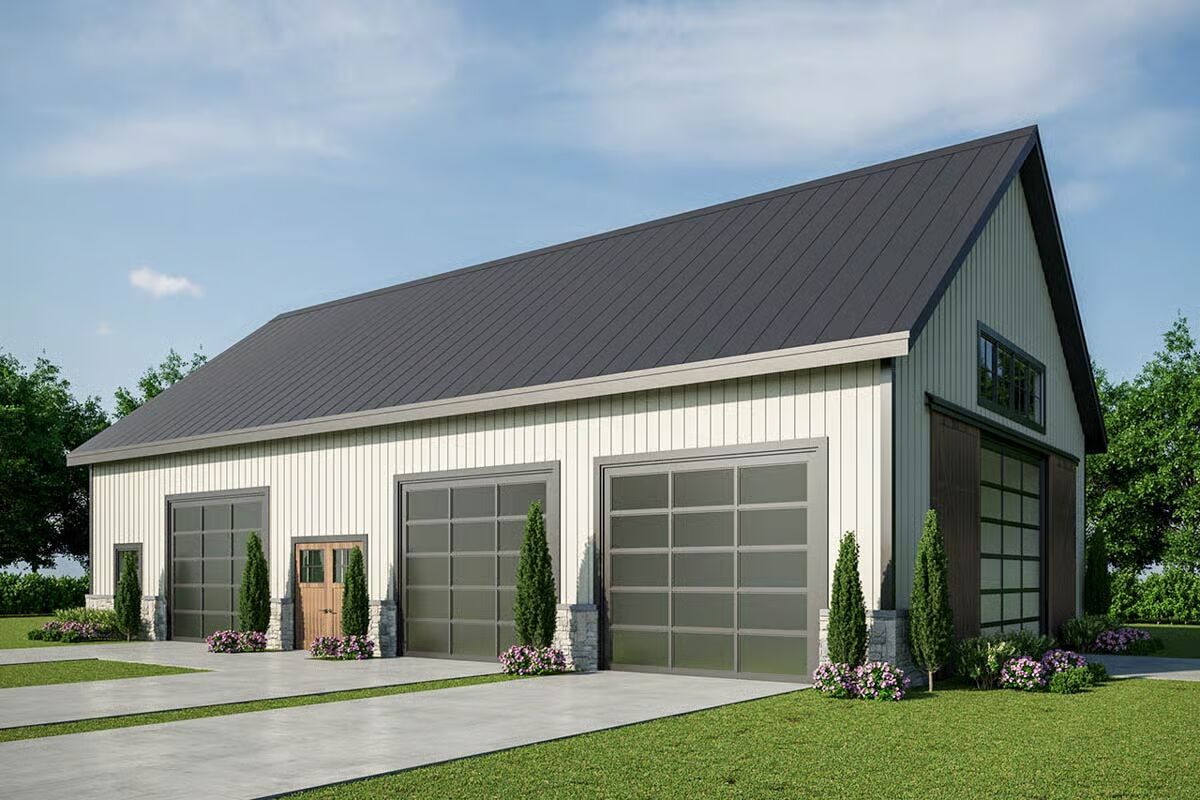 Distinctive design elements such as a metal roof, large glass-panel garage doors, and classic wood barn doors create striking curb appeal.