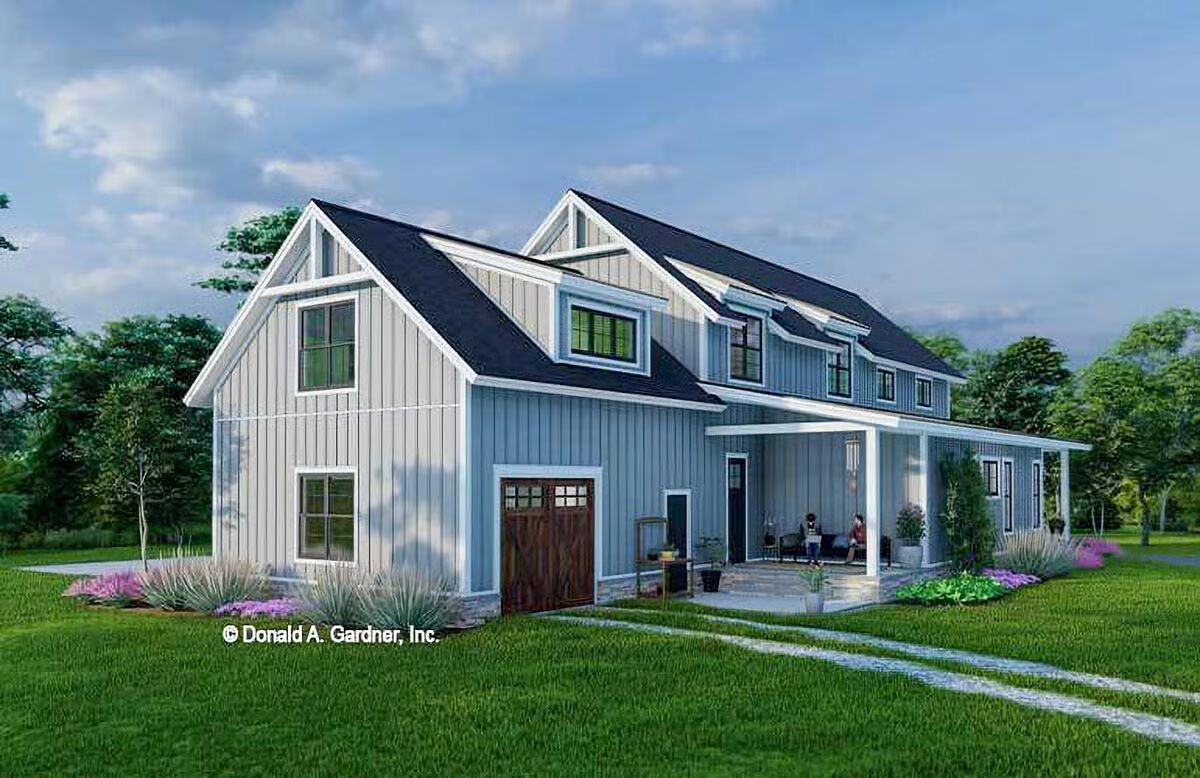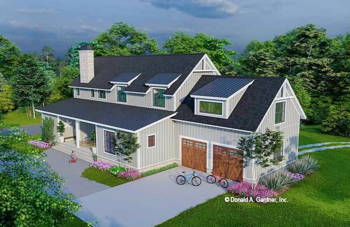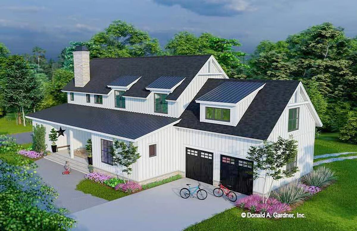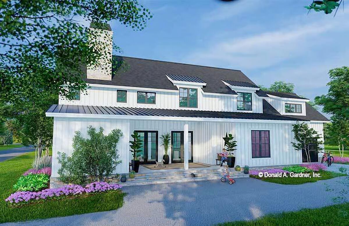 Buy This PlanThe striking white vertical siding and classic black windows make this a pristine example of a modern barndominium-style home.A modern farmhouse aesthetic shines through in this home’s clean lines, vertical siding, and welcoming front porch.A broad front porch and charming landscape beds highlight the inviting and comfortable feel of this striking modern farmhouse.This view captures the clean architectural symmetry and classic white facade of the house, creating a timeless and picturesque scene.This sleek white barndominium-style home features a classic gabled roof and a two-car garage with bold black doors.With its soaring chimney and sophisticated gray siding, this home exudes elegance while maintaining its barndominium-style character.This stylish gray barndominium-style house offers a seamless blend of contemporary design and rustic charm, complete with a long, inviting porch.A beautiful blue-gray exterior and contrasting wood garage door give this home a unique and captivating modern farmhouse feel.The dual garage doors in rich wood tones add a warm, natural contrast to the sleek gray and black palette of this stunning house.