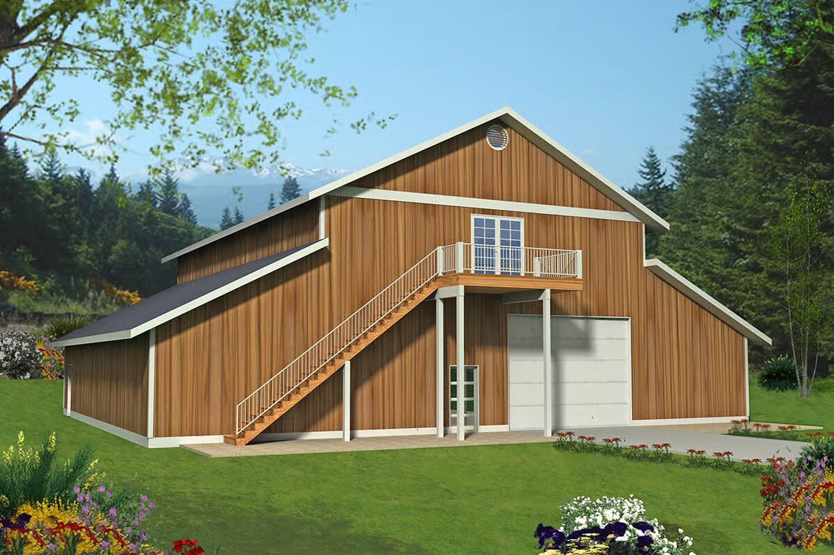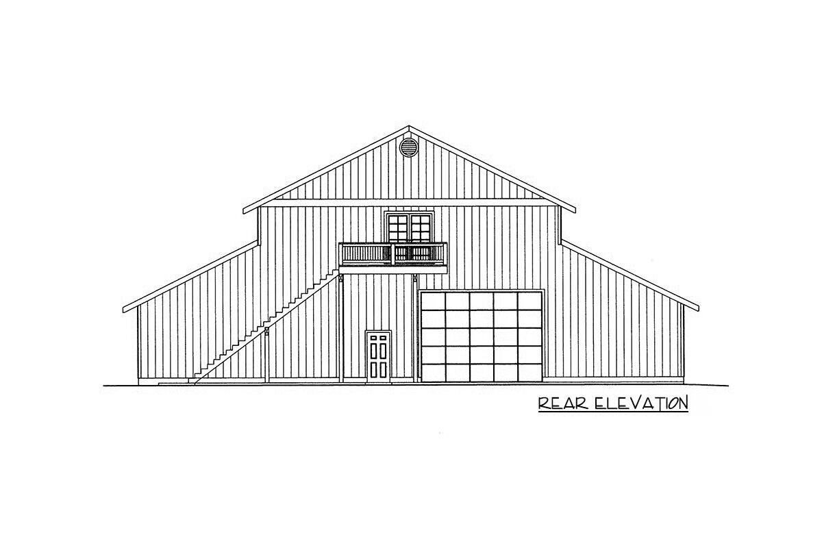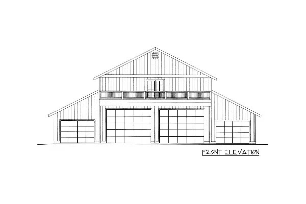 This impressive barndominium-style RV garage house plan combines functionality with rustic charm, offering an expansive 4,320 square feet of parking space across three bays.