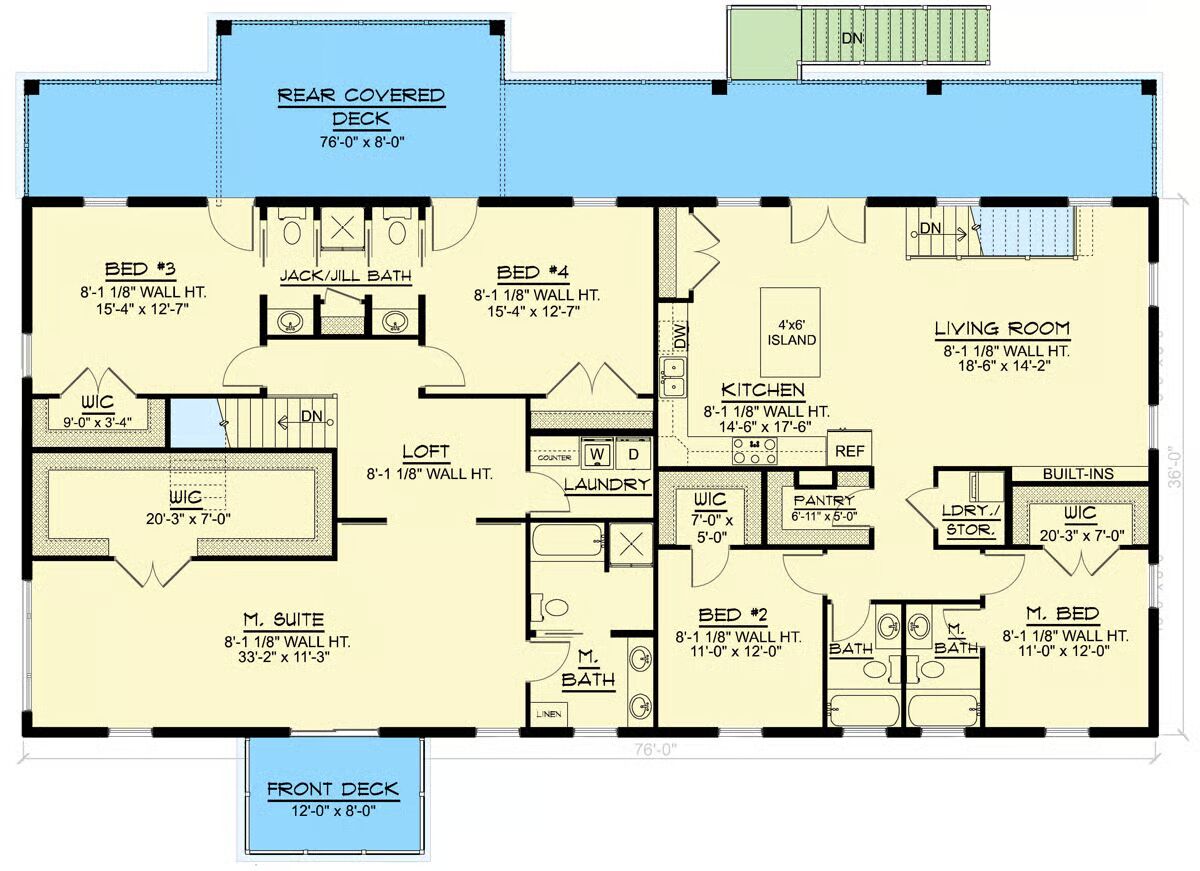 Outdoor living is embraced throughout the design, with covered front and rear porches on the main level and expansive upper-level decks offering space to relax, entertain, and take in the views.