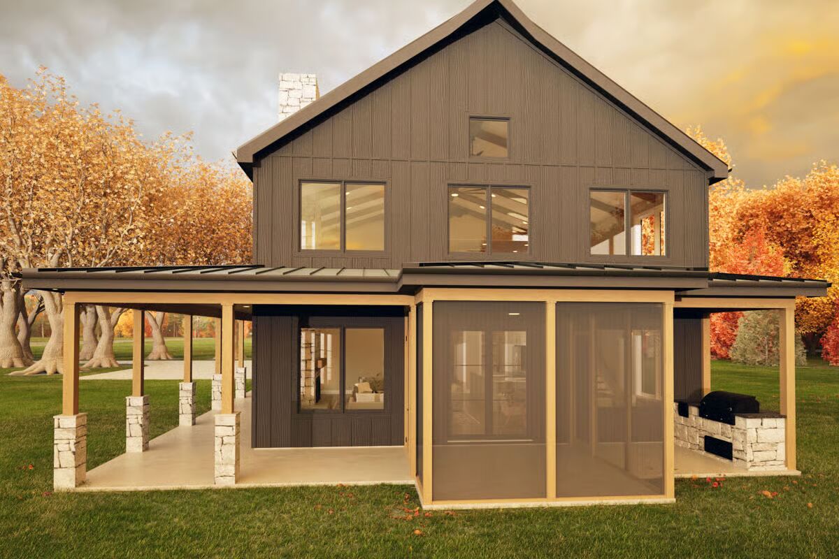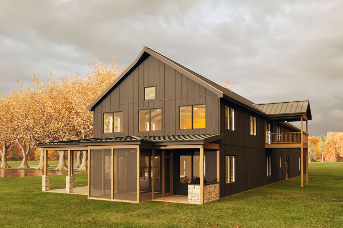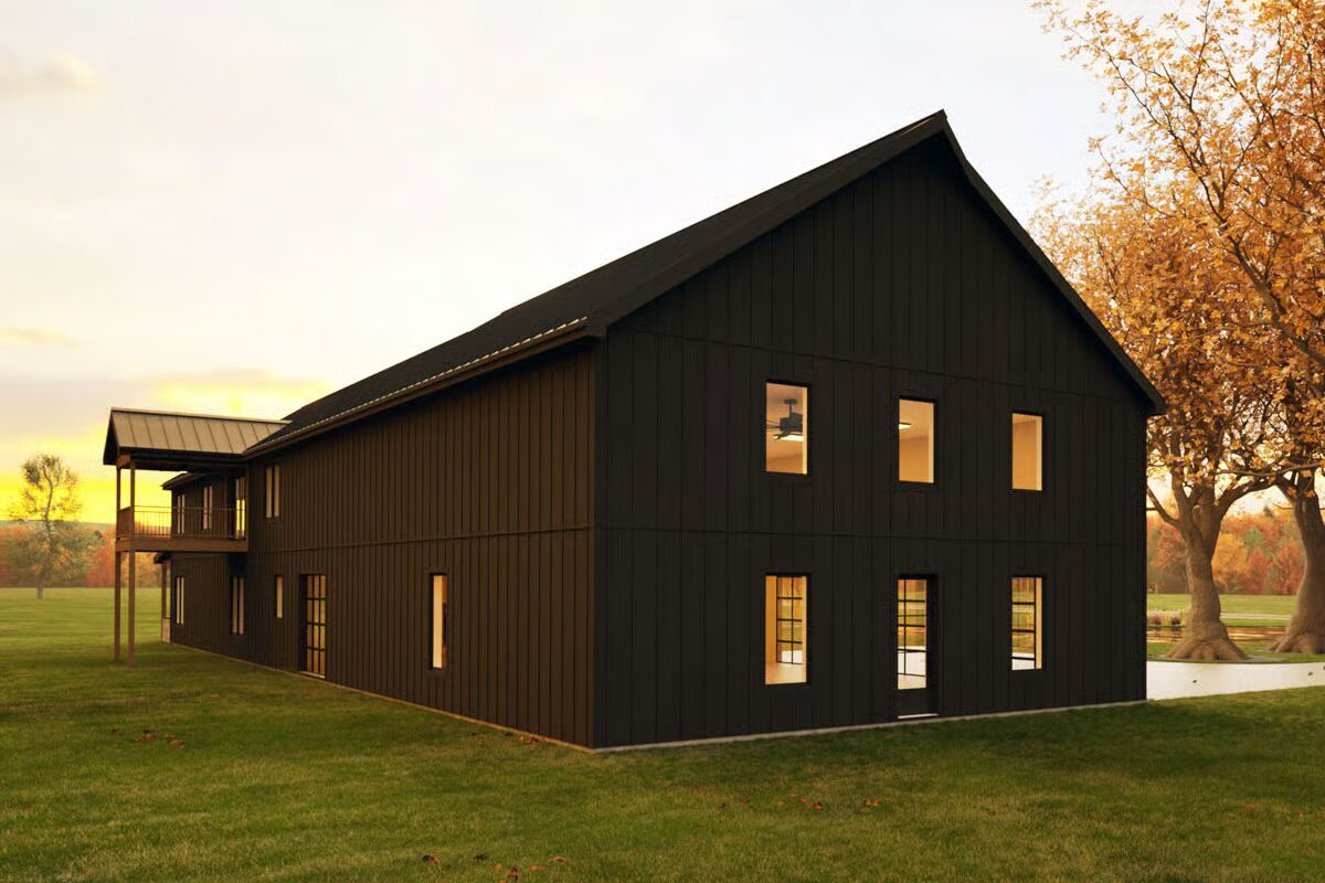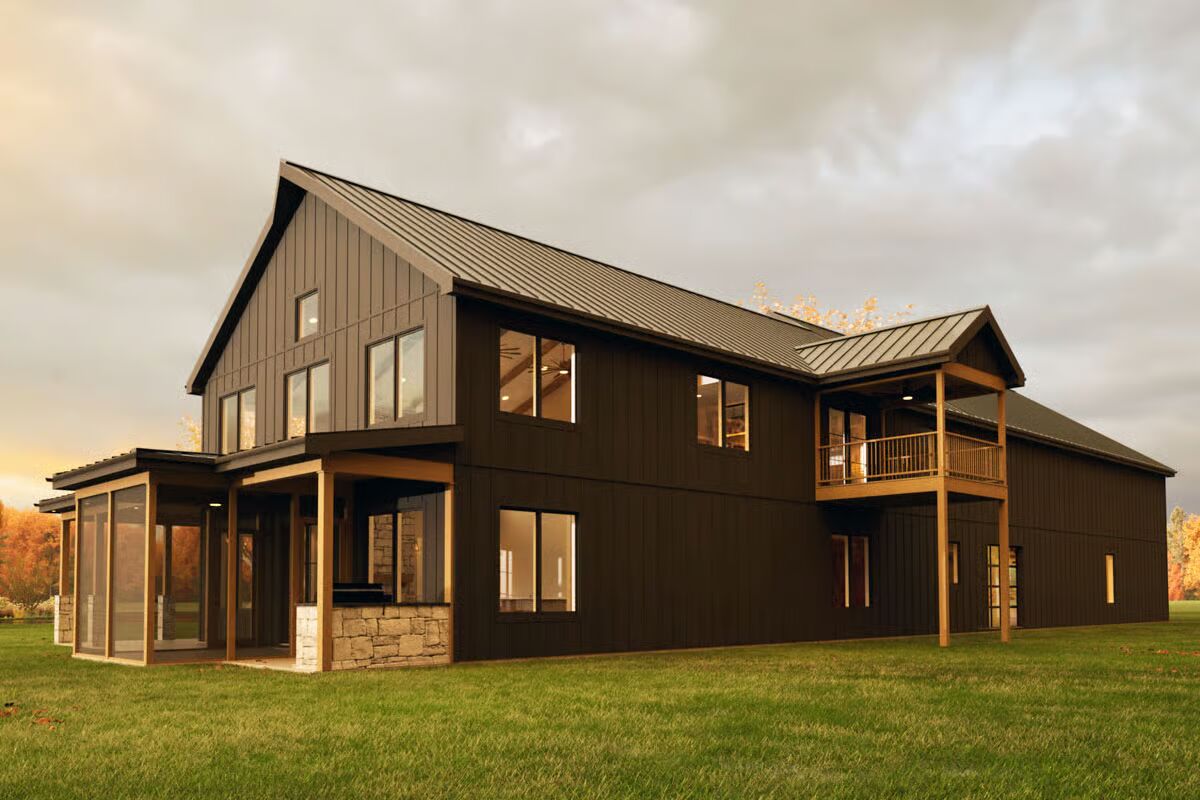 This striking barndominium-style house blends modern dark siding with classic stone accents under an autumn sky.A warm sunset glow highlights the expansive glass garage doors and sleek profile of this contemporary barndominium.The minimalist rear facade of this barndominium showcases its clean lines and connection to the vast autumn landscape.A charming balcony addition breaks the long, dark profile of this barndominium, offering a hint of outdoor living.Angled beautifully, this barndominium reveals its multi-level design and inviting screened porch, perfect for enjoying the outdoors.This elegant barndominium welcomes you with a grand screened porch and an integrated outdoor kitchen.The stone pillars and expansive covered porch create a stately, welcoming entrance to this modern country home.This open-concept space seamlessly combines a modern kitchen and dining area, all bathed in natural light.A towering stone fireplace anchors this living space, creating a cozy focal point beneath vaulted ceilings and large windows.From the spacious kitchen island, admire the impressive stone fireplace and the bright, inviting living area beyond.This peaceful bedroom offers a cozy, minimalist design with warm wood tones and a large window overlooking the countryside.The modern primary bathroom features a double vanity, a sleek glass-enclosed shower, and a clean, bright aesthetic.A deep, freestanding tub sits beside a large window, creating a serene and private escape.This functional laundry room and mudroom combination provides ample storage and a built-in bench for easy organization.A bright game room with a pool table and a wet bar offers the perfect space for entertainment.The garage space is more than just parkingāit’s a versatile, high-ceilinged area with a loft and large glass doors.Overlooking the garage below, the loft offers a second-story perspective with a contemporary metal railing.