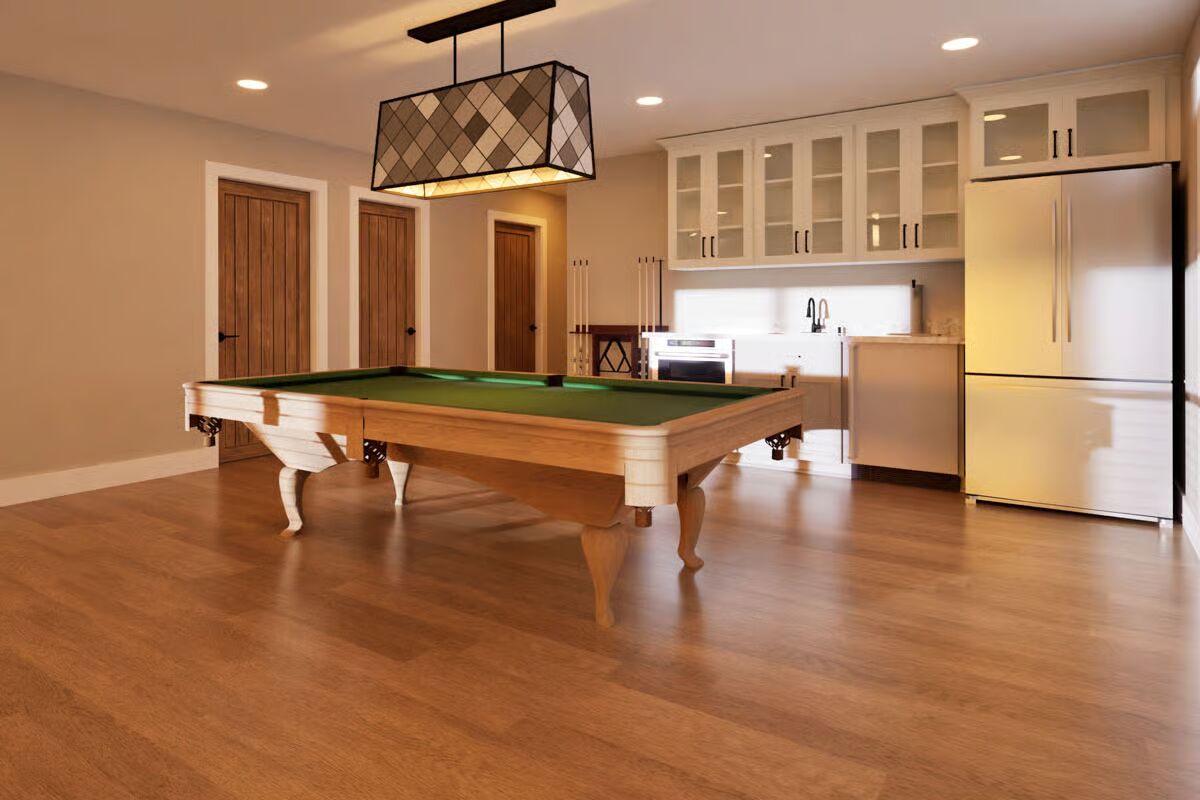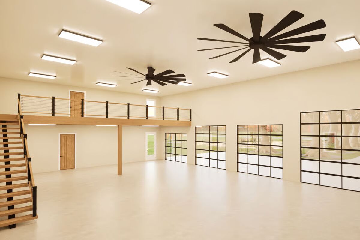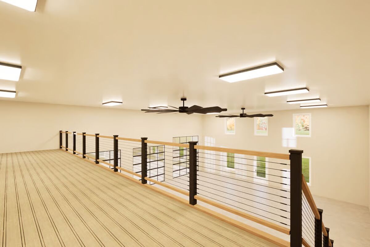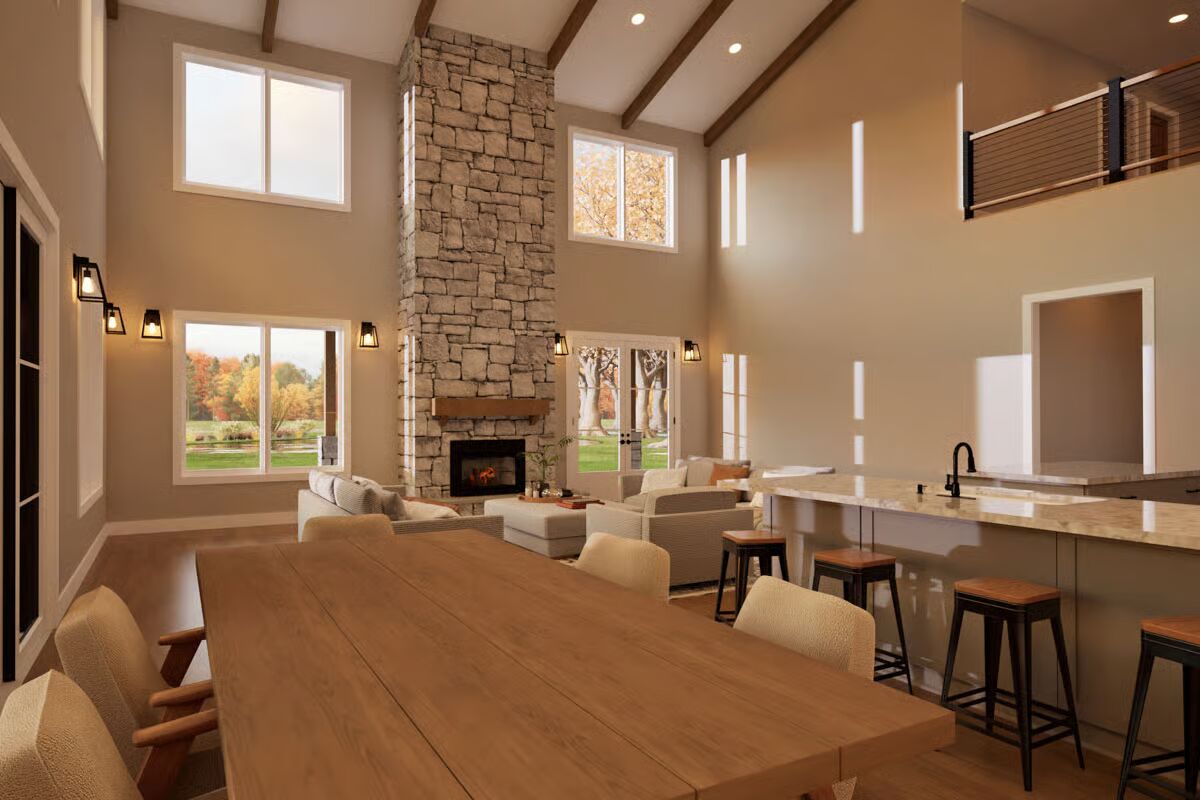 This striking barndominium-style house blends modern dark siding with classic stone accents under an autumn sky.A warm sunset glow highlights the expansive glass garage doors and sleek profile of this contemporary barndominium.The minimalist rear facade of this barndominium showcases its clean lines and connection to the vast autumn landscape.A charming balcony addition breaks the long, dark profile of this barndominium, offering a hint of outdoor living.Angled beautifully, this barndominium reveals its multi-level design and inviting screened porch, perfect for enjoying the outdoors.This elegant barndominium welcomes you with a grand screened porch and an integrated outdoor kitchen.The stone pillars and expansive covered porch create a stately, welcoming entrance to this modern country home.This open-concept space seamlessly combines a modern kitchen and dining area, all bathed in natural light.A towering stone fireplace anchors this living space, creating a cozy focal point beneath vaulted ceilings and large windows.From the spacious kitchen island, admire the impressive stone fireplace and the bright, inviting living area beyond.This peaceful bedroom offers a cozy, minimalist design with warm wood tones and a large window overlooking the countryside.The modern primary bathroom features a double vanity, a sleek glass-enclosed shower, and a clean, bright aesthetic.A deep, freestanding tub sits beside a large window, creating a serene and private escape.This functional laundry room and mudroom combination provides ample storage and a built-in bench for easy organization.A bright game room with a pool table and a wet bar offers the perfect space for entertainment.The garage space is more than just parkingāit’s a versatile, high-ceilinged area with a loft and large glass doors.Overlooking the garage below, the loft offers a second-story perspective with a contemporary metal railing.