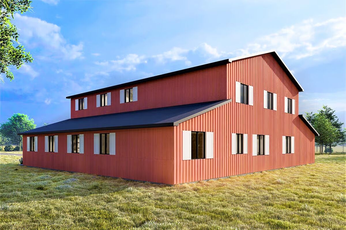 This barndominium-style home combines timeless barn-inspired architecture with charming wood trim and shutters that enhance its curb appeal.