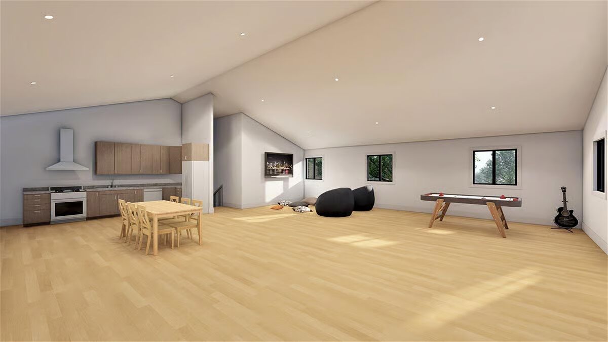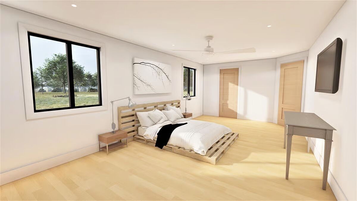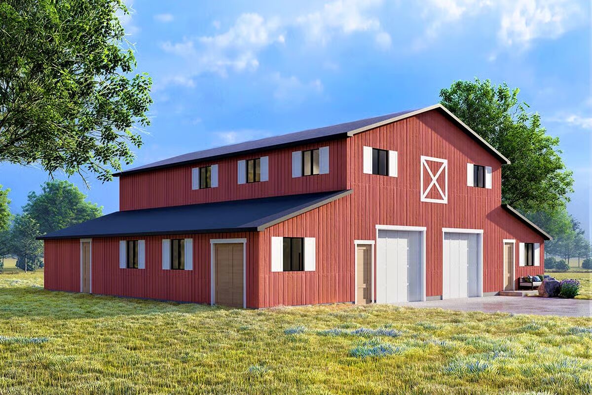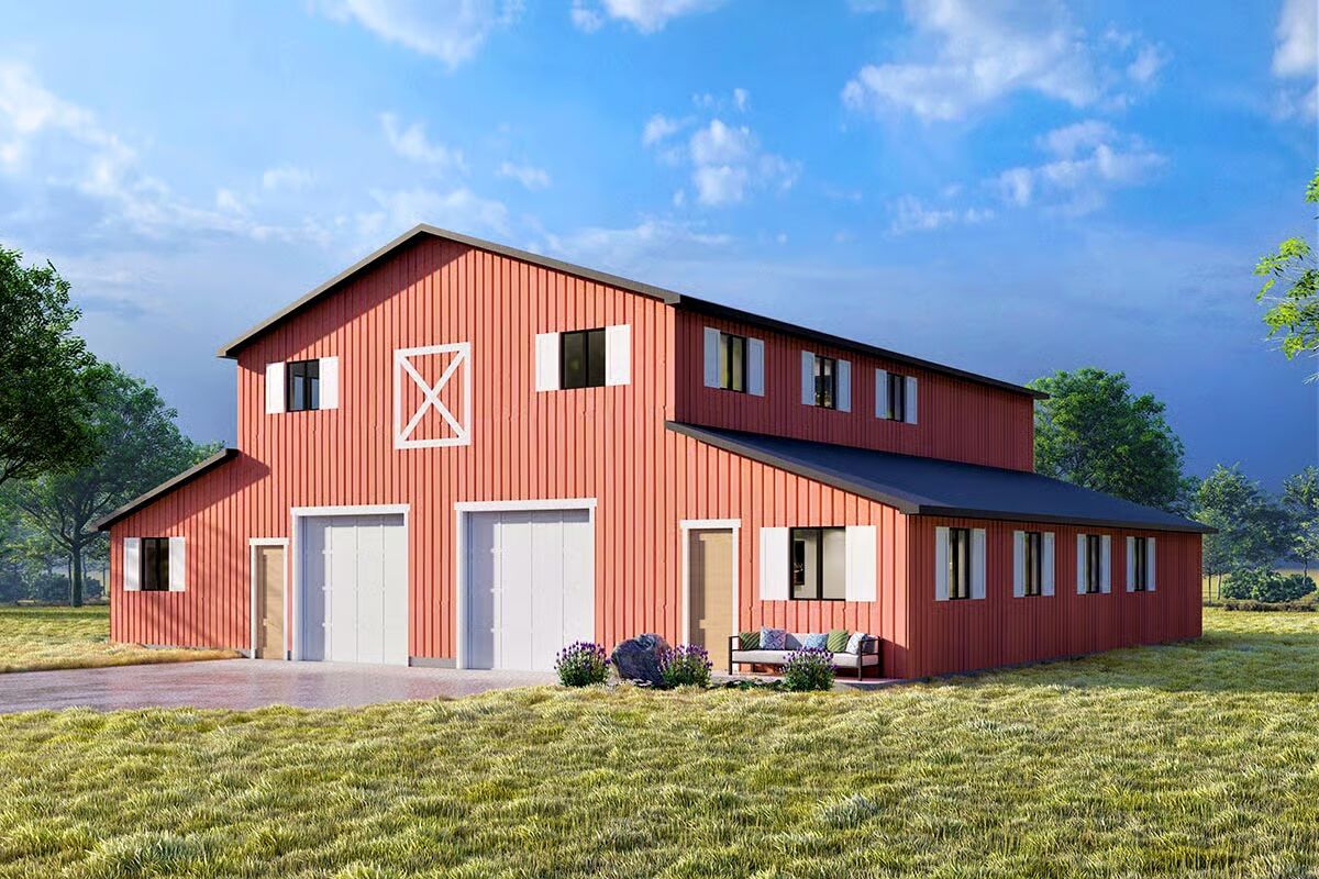 Buy This PlanThe home’s two-story main section is prominent, featuring white-shuttered windows on both floors and two large garage doors.This head-on perspective showcases the home’s symmetrical front façade. This side view of the home highlights its elongated structure and the multiple windows that allow for abundant natural light. A wide-angle view from the side shows the home’s impressive scale and architectural details. The main structure features a gabled roof and a distinct barn door ‘X’ detail, while a single-story wing extends to the right, adding to the home’s unique country aesthetic.The open-concept living area is bright and inviting, with light wood floors and white walls.A sleek, wall-mounted television, dark wood media console, and gray cozy seating complement the light-filled room.The primary bedroom is a serene and minimalist retreat, where the space is flooded with light from two large windows, one of which offers an expansive view of the outdoors.This modern bathroom features a sleek, corner walk-in shower with grey mosaic tile and a clear glass enclosure.An alternate view of the large open-concept space on the second floor reveals its full potential as a multi-purpose room.
