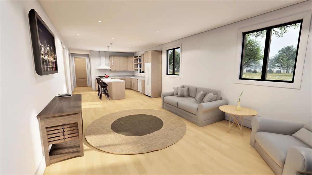 When finished as shown, it adds an impressive 1,646 square feet with a complete in-law apartment featuring a living room, full kitchen, two bedrooms with en-suite baths, an additional bathroom, and abundant storage.