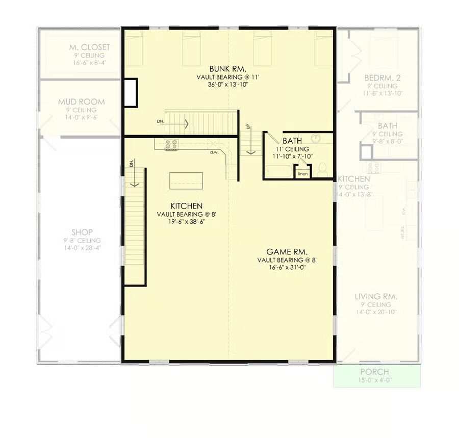 Welcome to the gallery of photos for the Barndominium-Style House with Two Kitchens and Upstairs Game and Bunk Rooms. The floor plans are shown below: