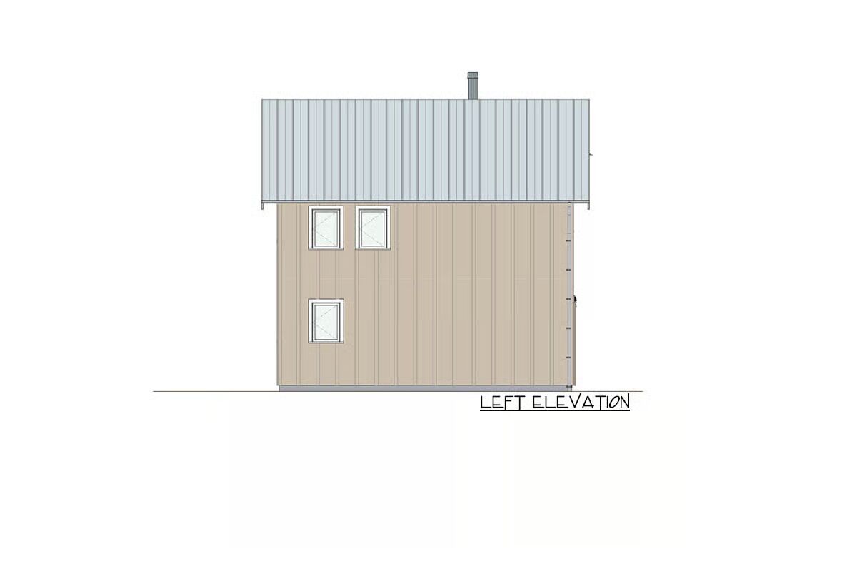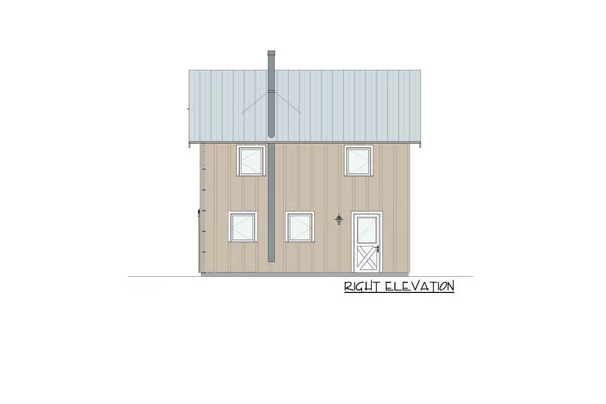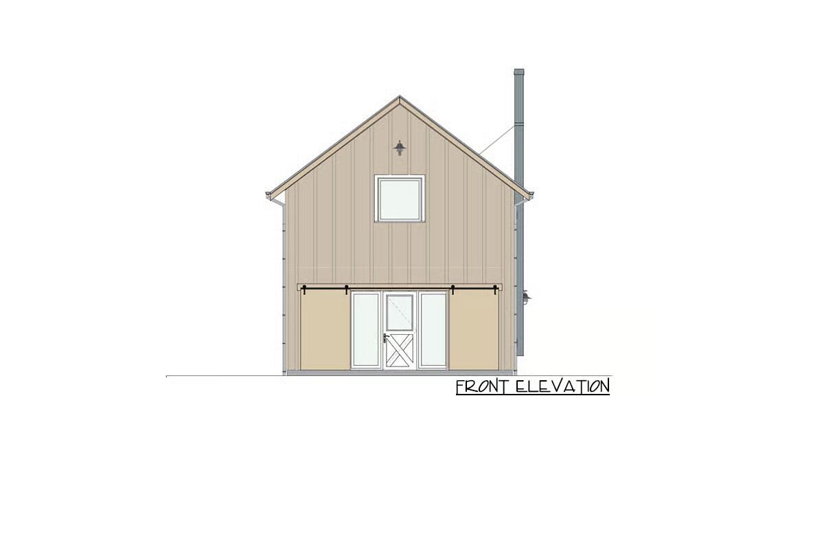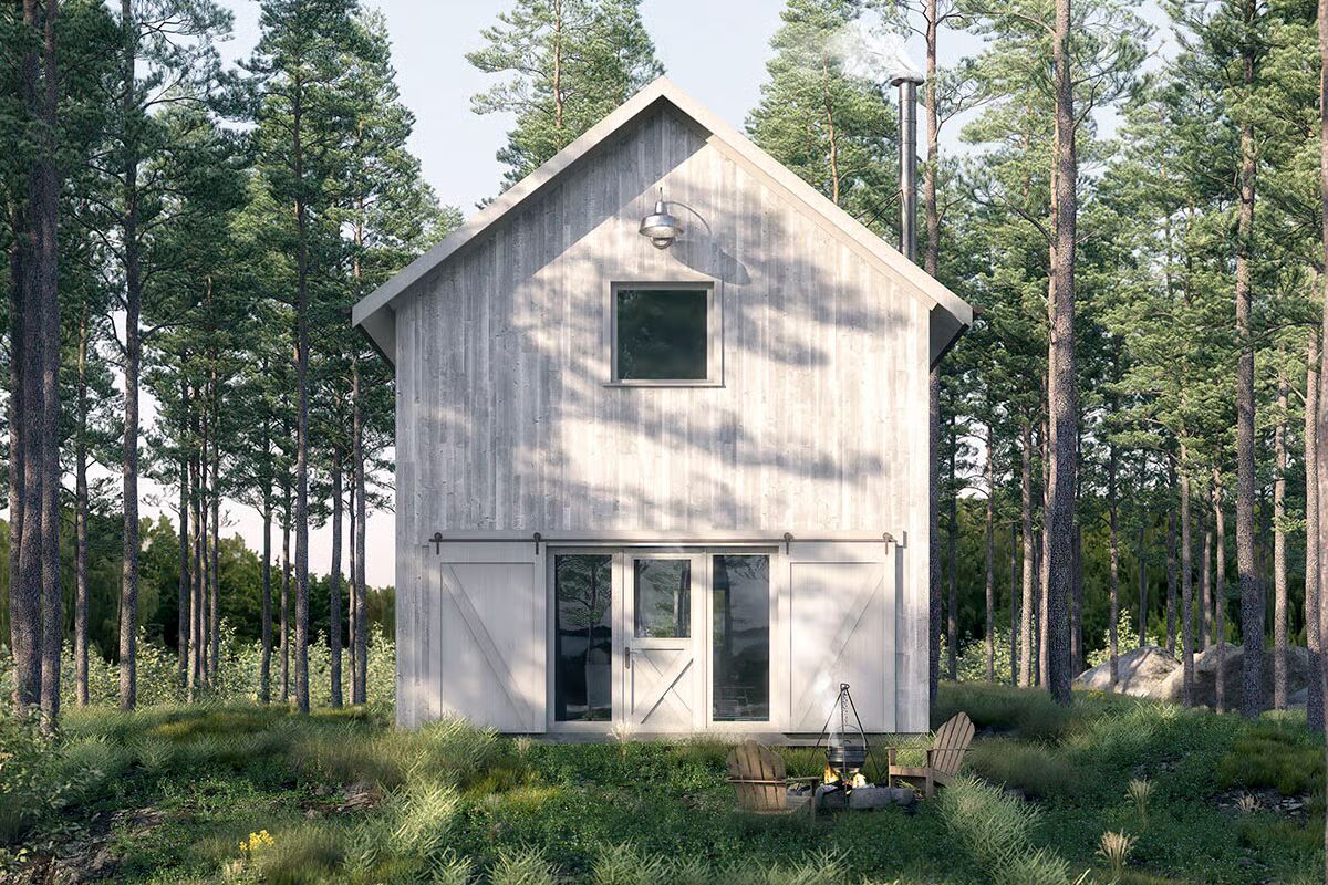 Rustic charm meets efficient living in this 1,000-square-foot tiny home plan, where vertical siding and barn-style doors evoke the warmth of a classic country retreat.