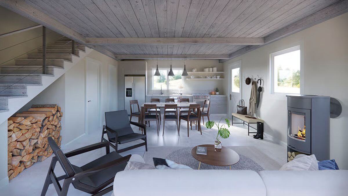 Upstairs, you’ll find two vaulted bedrooms and a full bath, completing this thoughtfully designed layout that perfectly blends rustic character with modern simplicity.