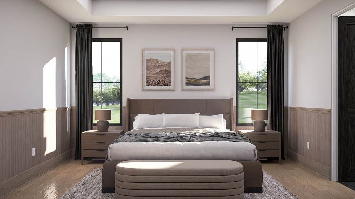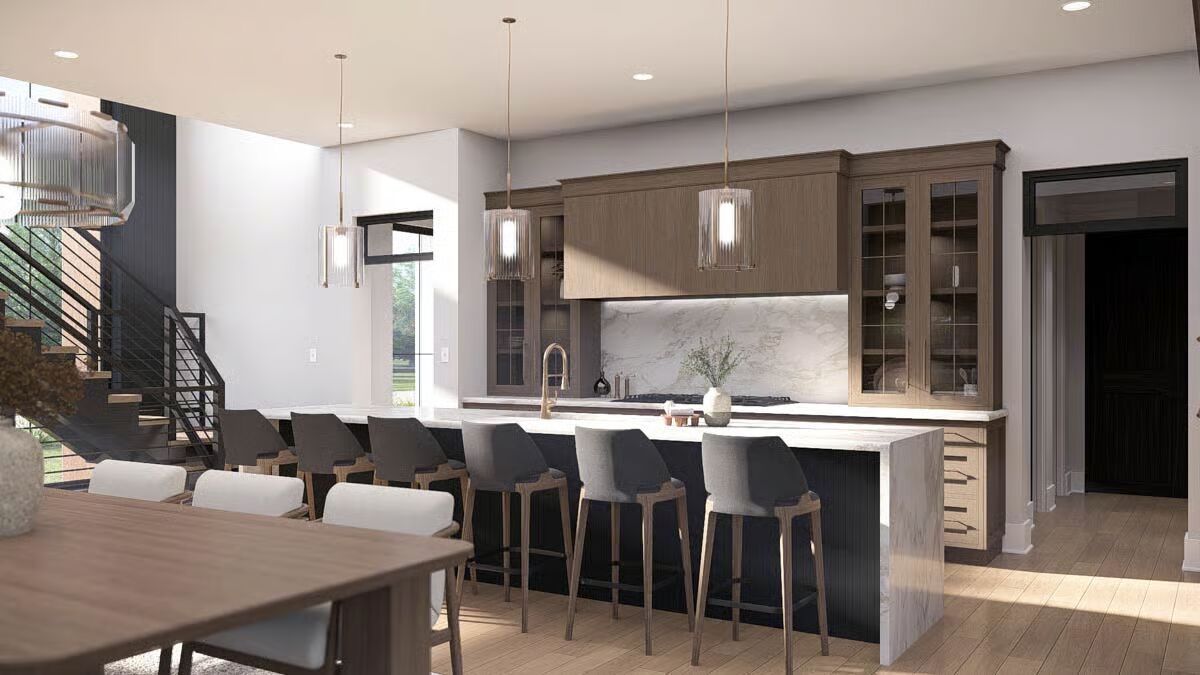 A dramatic two-story great room welcomes you inside, where soaring windows flood the space with natural light and create a striking sense of openness.