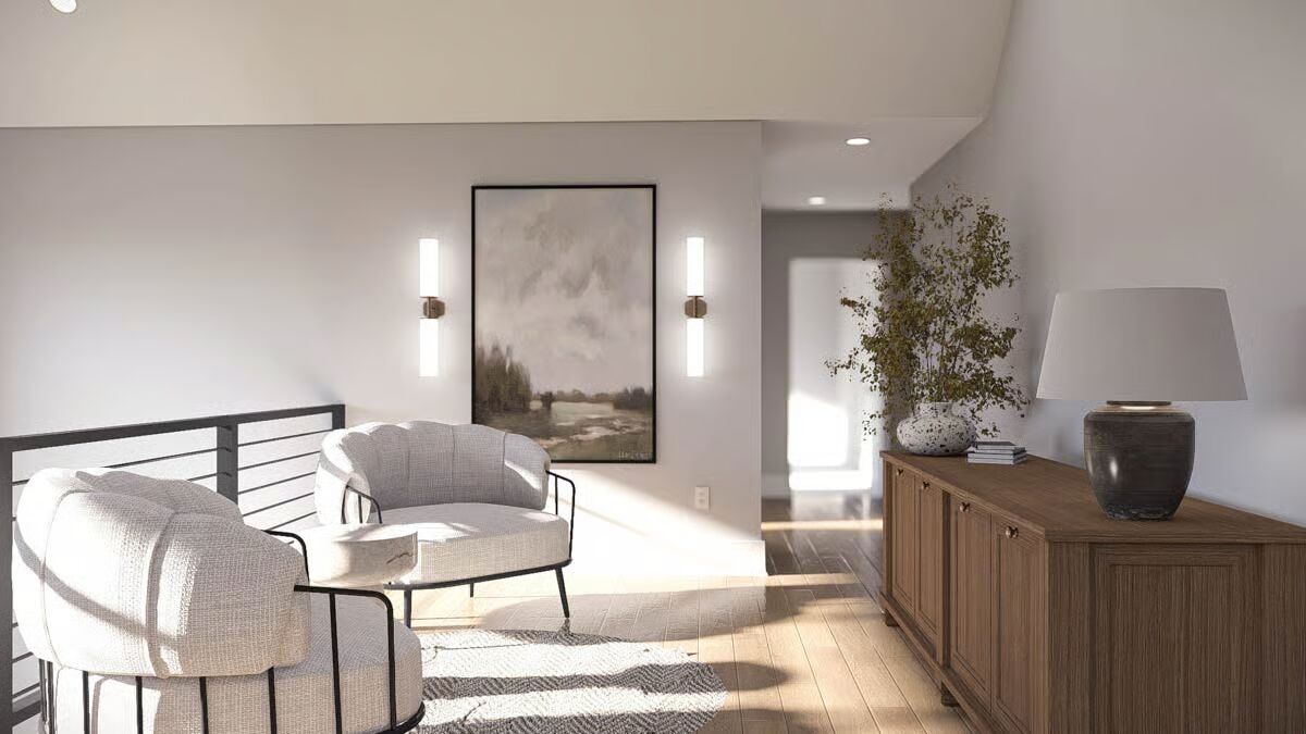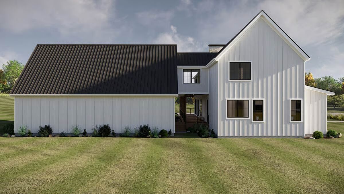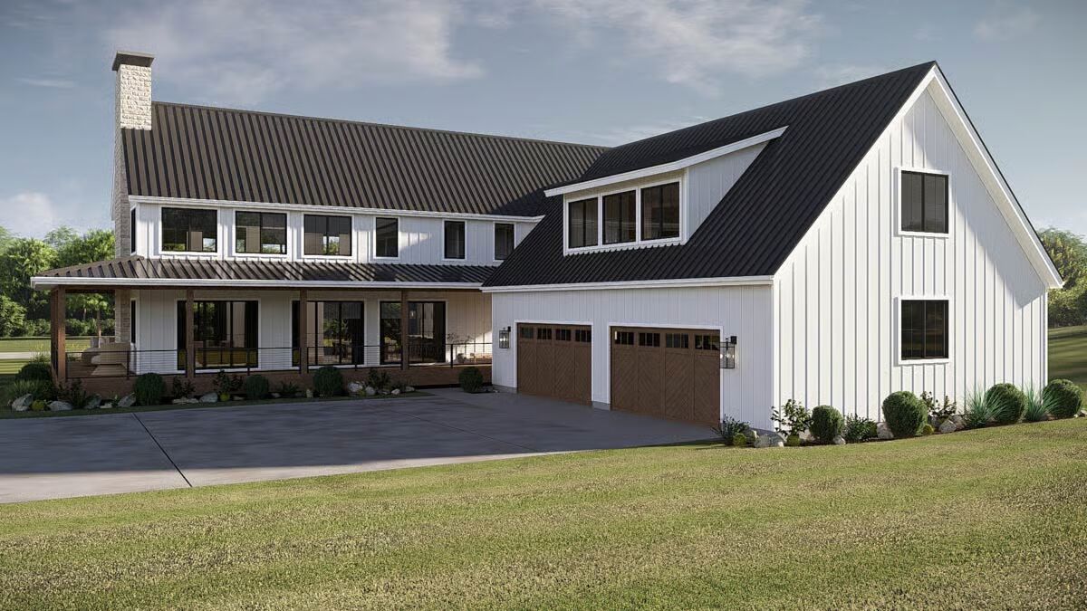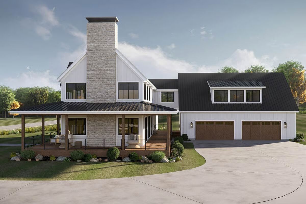 This striking barndominium-style home features a classic white vertical siding, black metal roof, and a dramatic two-story window wall.A close-up of the inviting covered porch highlights the warm wood deck, contemporary cable railings, and stone accent siding.A clean, modern side profile emphasizes the vertical white board-and-batten siding and the contrasting black metal roofline.The side view showcases a large stone chimney, an expansive covered porch, and a three-car garage bay with wood-look doors.The modern farmhouse structure is complemented by a mix of clean white siding and a large attached garage with attractive wooden carriage doors.The elegant dining area boasts a large wooden table, sophisticated seating, and floor-to-ceiling windows overlooking the yard.The dining room and kitchen flow seamlessly, anchored by a tiered modern chandelier and featuring a glimpse of the dark, custom cabinetry.The grand, open-concept living area features double-height ceilings, a striking black staircase, and plush modern seating.A massive, two-story stone fireplace serves as a dramatic focal point in this brightly lit living room with rich wooden accents.This gourmet kitchen features rich, dark wood cabinetry, a large marble island, and contemporary fluted glass pendant lights.An alternative angle of the kitchen highlights the spacious seating at the island and the open view toward the dramatic interior staircase.The upper landing or loft space is a cozy retreat featuring modern armchairs, a wood console table, and abstract wall art.A view from the bedroom looks into the primary bathroom, revealing a cohesive design with neutral colors and warm wood accents.The luxurious primary bathroom offers a double vanity with a marble counter, modern mirrors, and a spacious glass-enclosed shower.A stunning black metal and wood floating staircase is set against a huge window, maximizing natural light and offering a view of the outdoors.This tranquil bedroom features wainscoting, tall windows, and a plush, earth-toned bed set between matching nightstands.