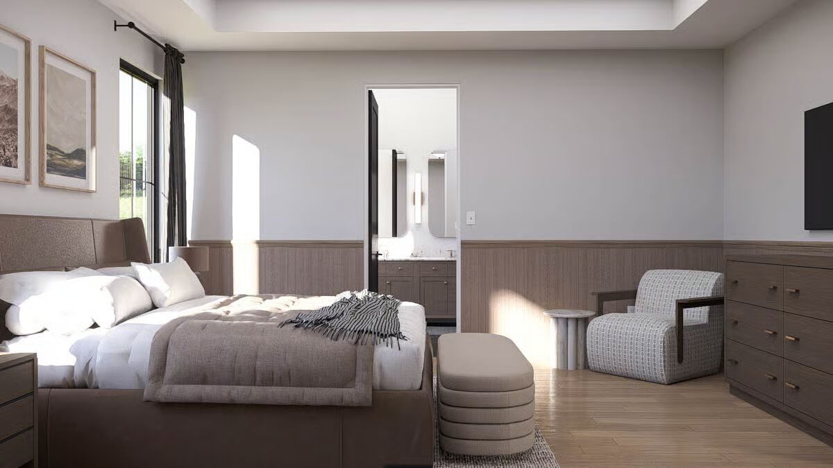 The private first-floor owner’s suite serves as a peaceful retreat, thoughtfully separated from the additional bedrooms upstairs.