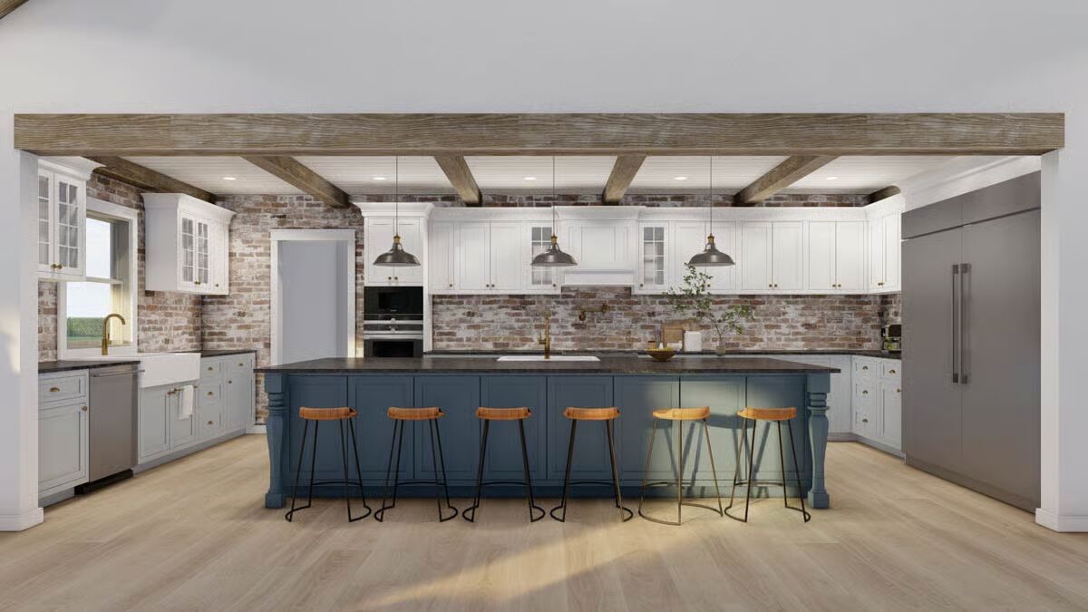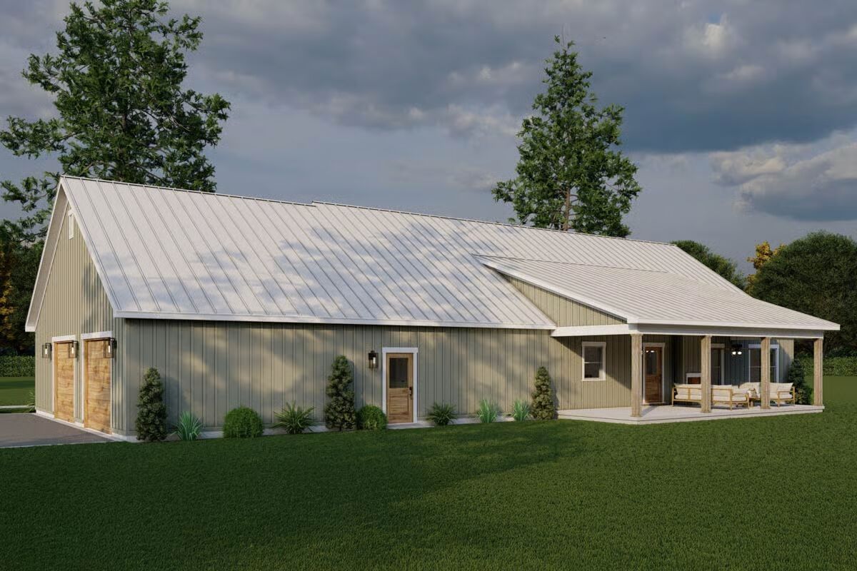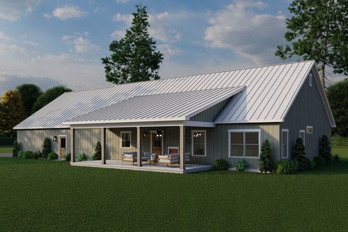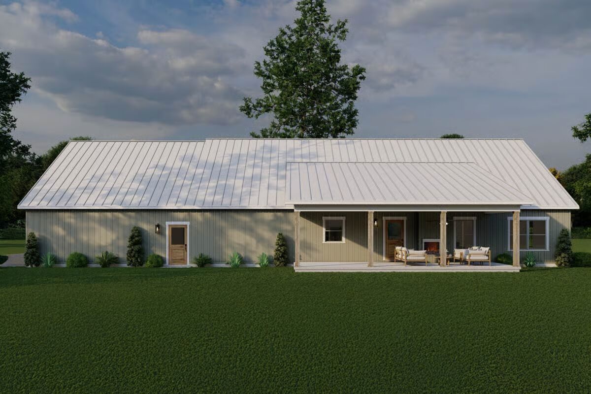 The stunning facade of the Barndominium-style home featuring a bright metal roof and board-and-batten siding.A classic view highlighting the wide profile and welcoming, covered entryway of the modern Barndominium.This angle shows the seamless integration of the front and the attached garage with natural wood-look doors.The simple, clean lines of the side elevation showcase the home’s contemporary farmhouse aesthetic.The long rear elevation emphasizes the home’s low-maintenance siding and the comfortable, sheltered porch area.The spacious covered back porch offers an ideal outdoor retreat with ample room for relaxation and entertaining.A rear corner view shows the covered back porch extending from the main structure, perfect for outdoor living.The clean, gable end of the garage features two stylish wooden garage doors with modern sconce lighting.The expansive open floor plan showcases soaring vaulted ceilings and a clear view between the living, dining, and kitchen areas.The bright, airy living room is defined by a vaulted ceiling, a brick fireplace, and direct access to the adjacent dining area.The spacious kitchen boasts exposed wood beams, a brick backsplash, and a large island with bar seating.A comfortable corner of the living room features a rustic brick fireplace next to a striking natural wood door.The eye-catching kitchen connects seamlessly to the living area, featuring a cozy fireplace visible in the background.This perspective highlights the kitchen’s rustic charm with brick walls, wood ceilings, and a massive blue island.A grand central island with a striking blue base and farmhouse sink anchors the open-concept living space.The inviting dining space features a farmhouse table and wicker-back chairs under a simple, elegant piece of art.