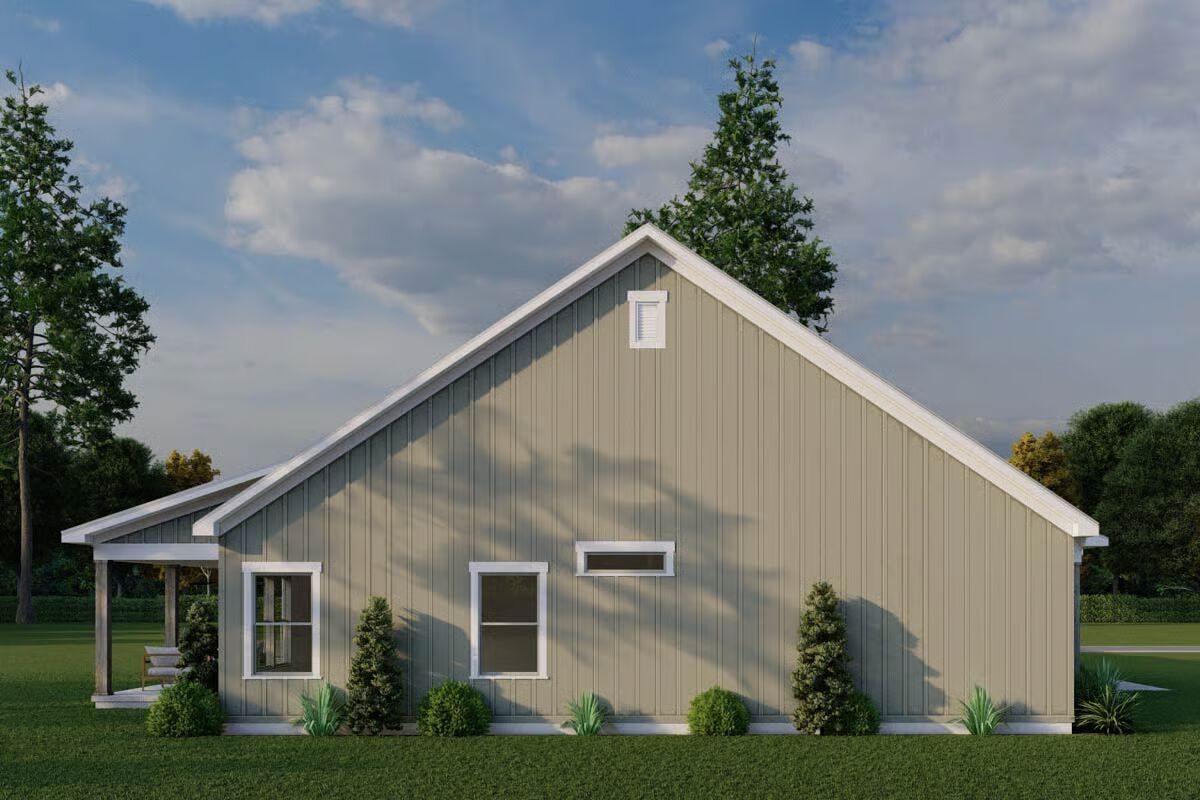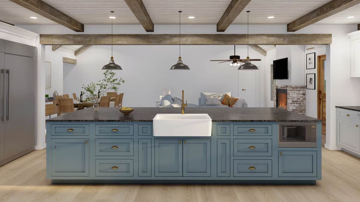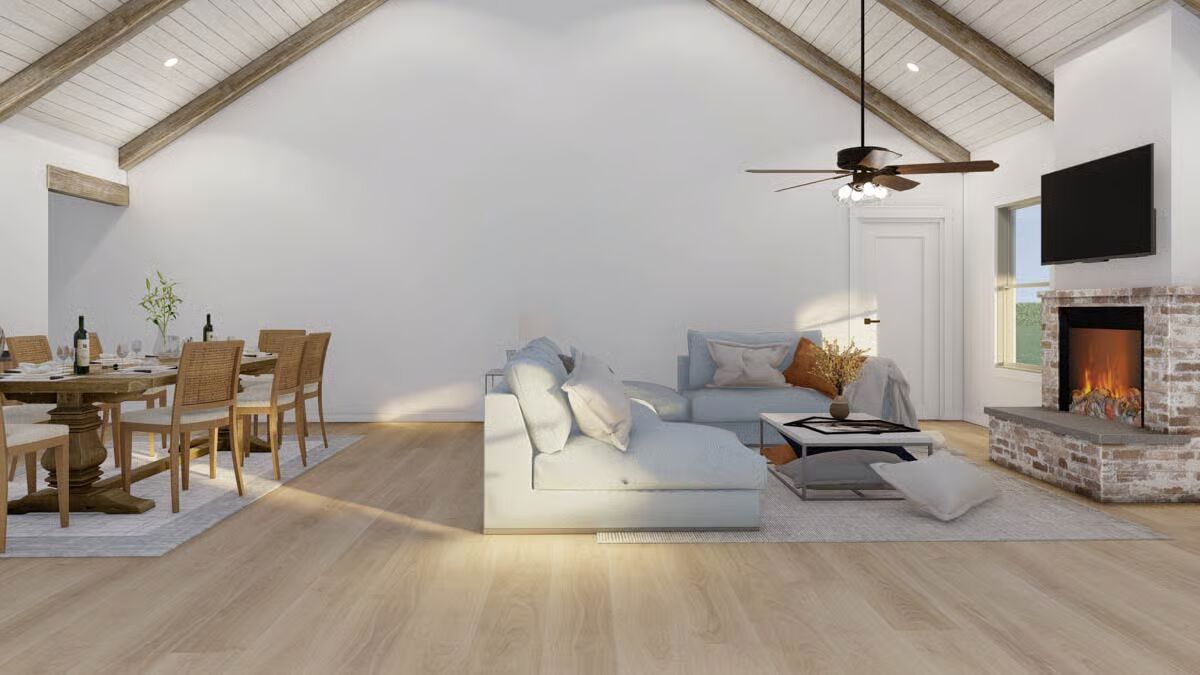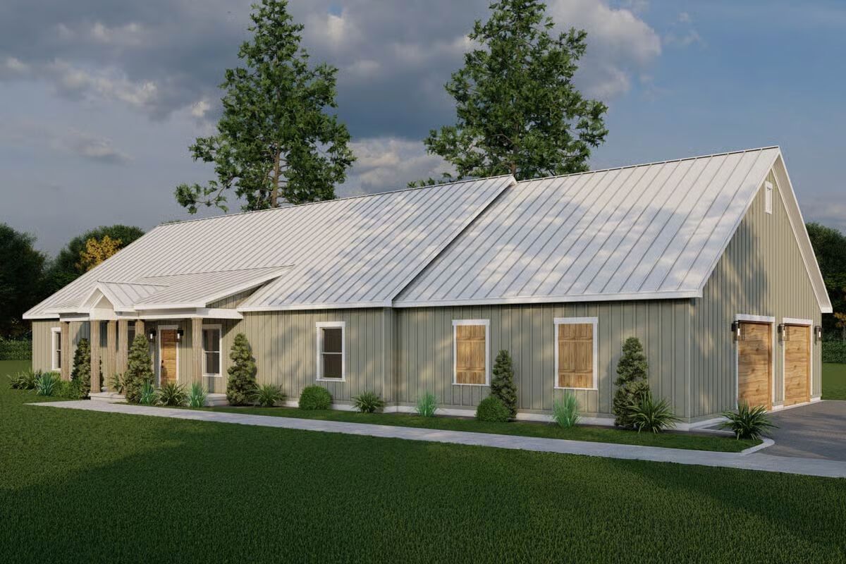 The stunning facade of the Barndominium-style home featuring a bright metal roof and board-and-batten siding.A classic view highlighting the wide profile and welcoming, covered entryway of the modern Barndominium.This angle shows the seamless integration of the front and the attached garage with natural wood-look doors.The simple, clean lines of the side elevation showcase the home’s contemporary farmhouse aesthetic.The long rear elevation emphasizes the home’s low-maintenance siding and the comfortable, sheltered porch area.The spacious covered back porch offers an ideal outdoor retreat with ample room for relaxation and entertaining.A rear corner view shows the covered back porch extending from the main structure, perfect for outdoor living.The clean, gable end of the garage features two stylish wooden garage doors with modern sconce lighting.The expansive open floor plan showcases soaring vaulted ceilings and a clear view between the living, dining, and kitchen areas.The bright, airy living room is defined by a vaulted ceiling, a brick fireplace, and direct access to the adjacent dining area.The spacious kitchen boasts exposed wood beams, a brick backsplash, and a large island with bar seating.A comfortable corner of the living room features a rustic brick fireplace next to a striking natural wood door.The eye-catching kitchen connects seamlessly to the living area, featuring a cozy fireplace visible in the background.This perspective highlights the kitchen’s rustic charm with brick walls, wood ceilings, and a massive blue island.A grand central island with a striking blue base and farmhouse sink anchors the open-concept living space.The inviting dining space features a farmhouse table and wicker-back chairs under a simple, elegant piece of art.