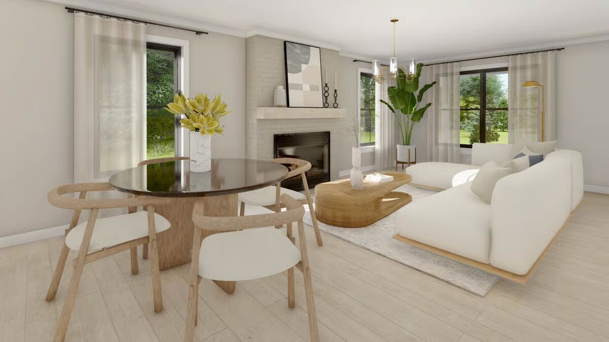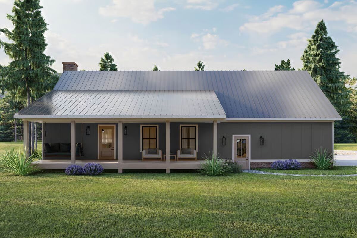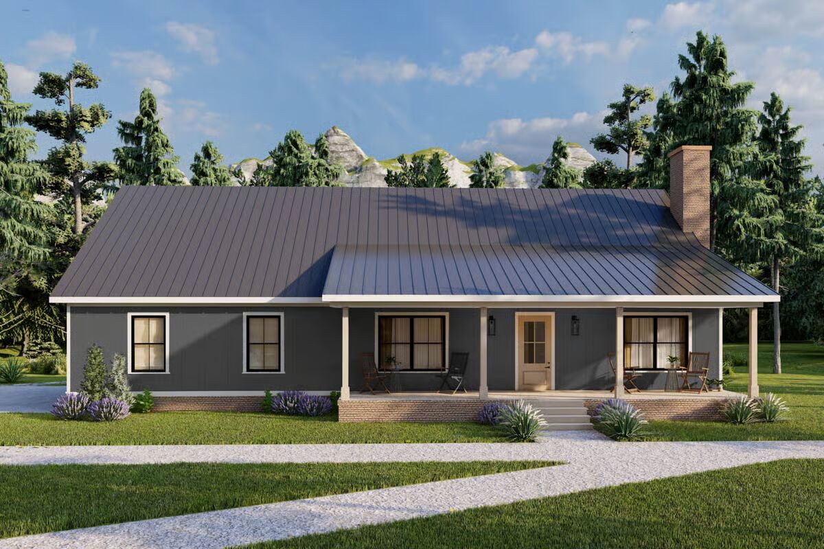Buy This PlanThis charming farmhouse welcomes you with a classic front porch and stunning mountain views, perfect for peaceful living.Enjoy lazy afternoons on the inviting front porch, with a stylish swing and rocking chairs creating the ultimate relaxation spot.A spacious two-car garage complements the home’s striking dark siding and A-frame roofline, blending modern function with rustic appeal.This open-concept living and dining area is the perfect blend of cozy and chic, centered around a stunning fireplace and flooded with natural light.An immaculate white kitchen with a sleek marble island and warm brass accents creates a bright, elegant space for culinary creativity.The main bedroom is a tranquil retreat featuring a modern barn door and serene, neutral tones for a restful escape.