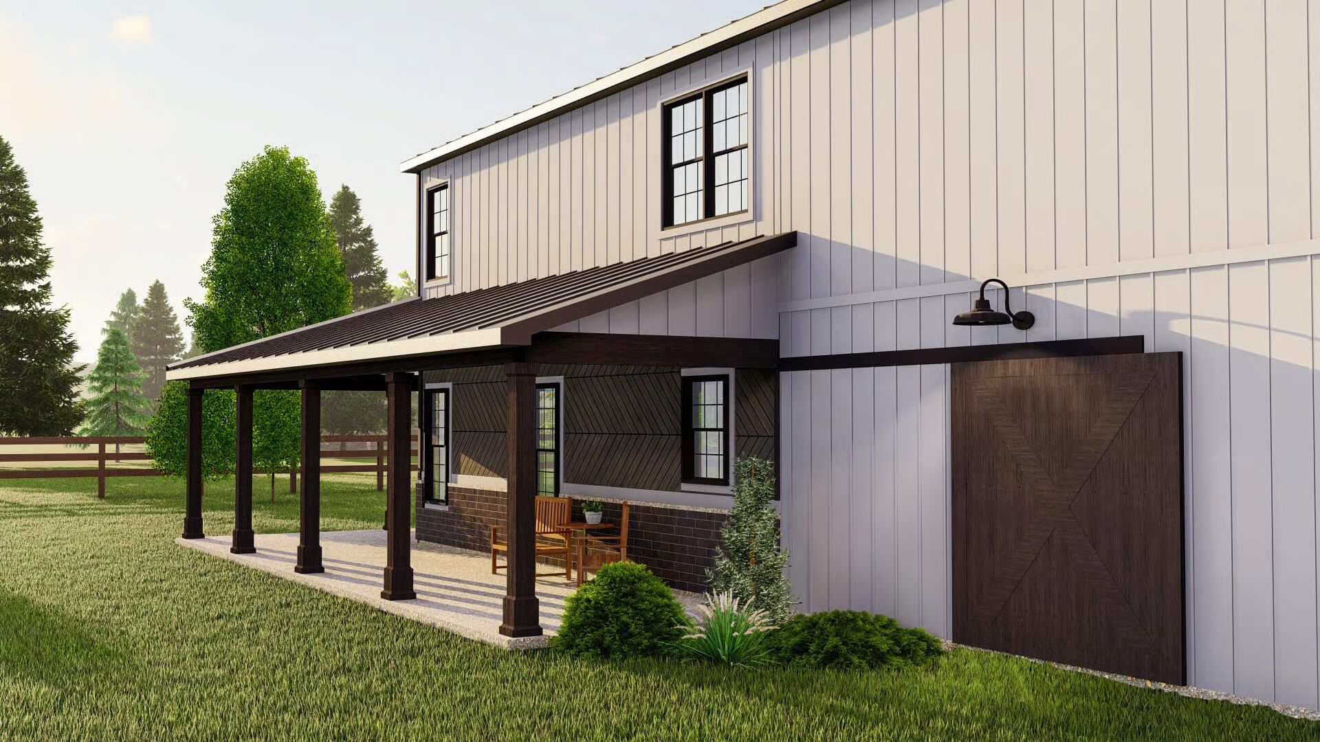 Finished with 24″ vertical board and batten cement siding, this home exudes lasting durability and classic country style.