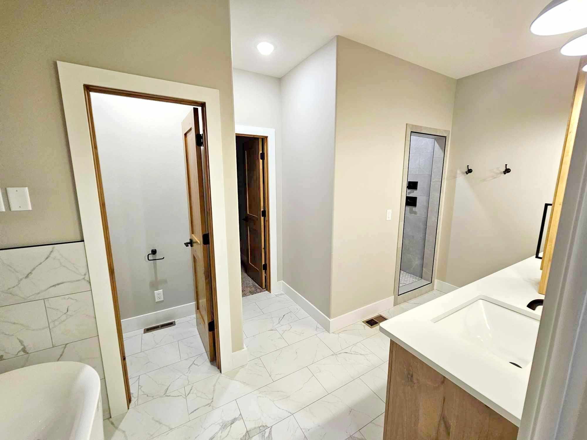 The bathroom features a pocket door for entry to the master bathroom, while another door ensures privacy for the toilet area.