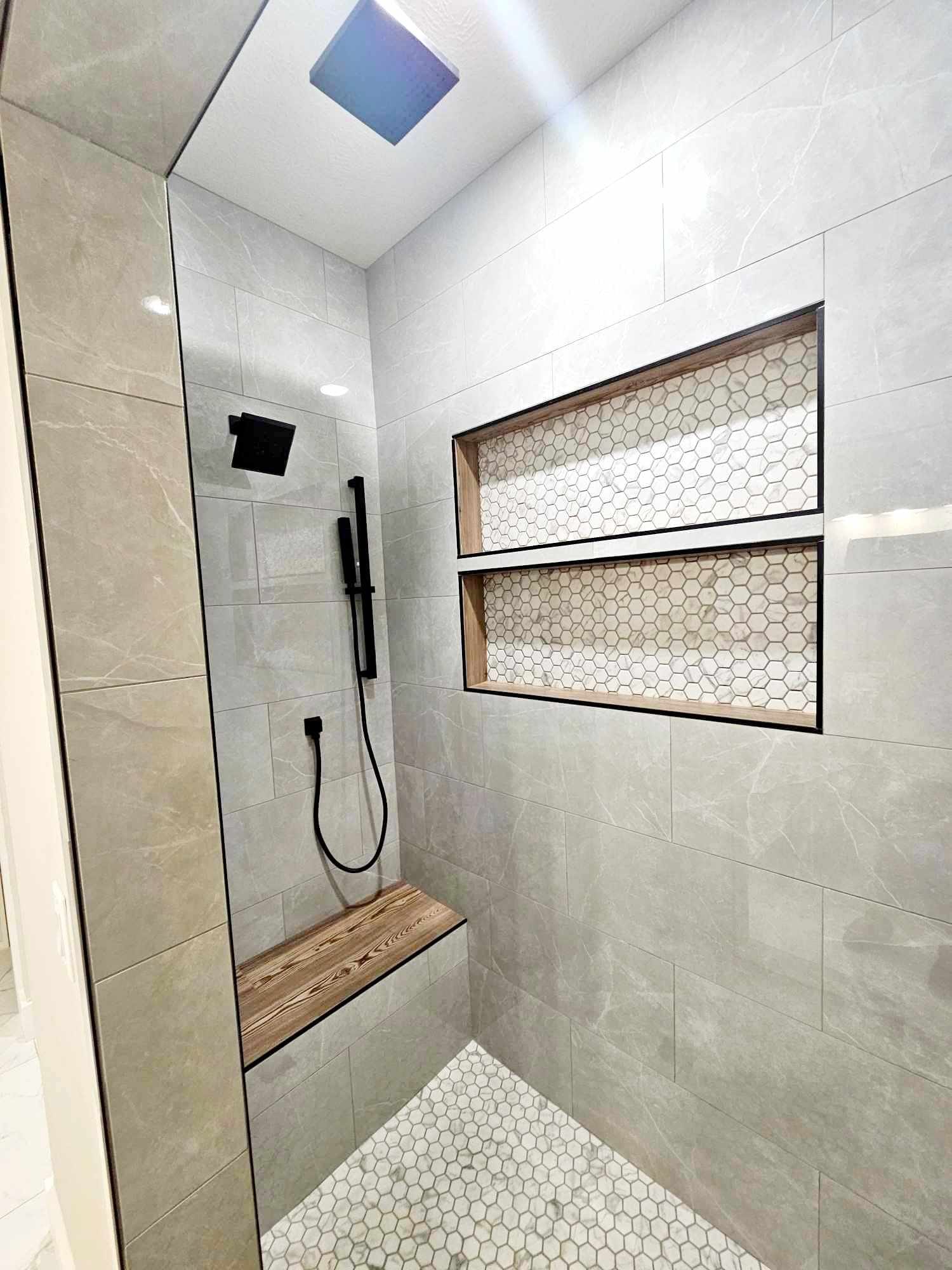 The shower is equipped with a variety of tiles, including a bench and a built-in shelf in the wall, complemented by black fixtures.