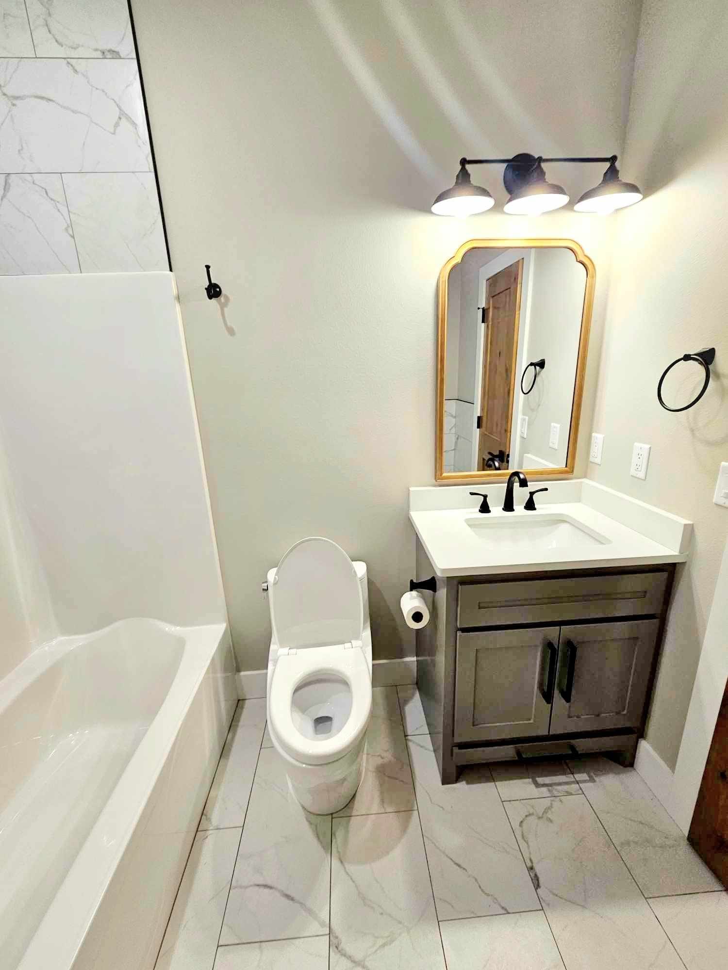 A gold-framed mirror accents the area above the sink.