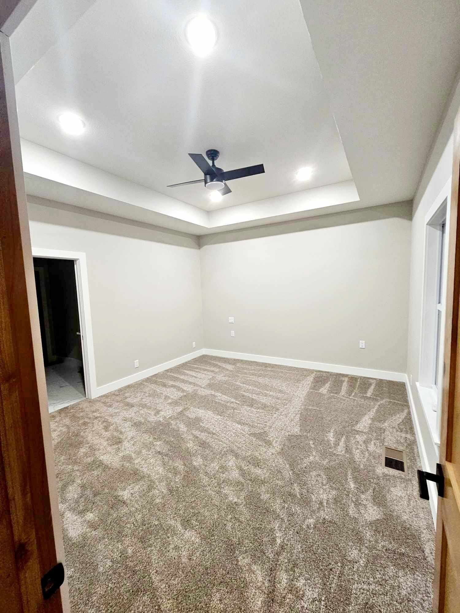 In this bedroom, the space is carpeted and features a tray ceiling at a height of 10 feet.