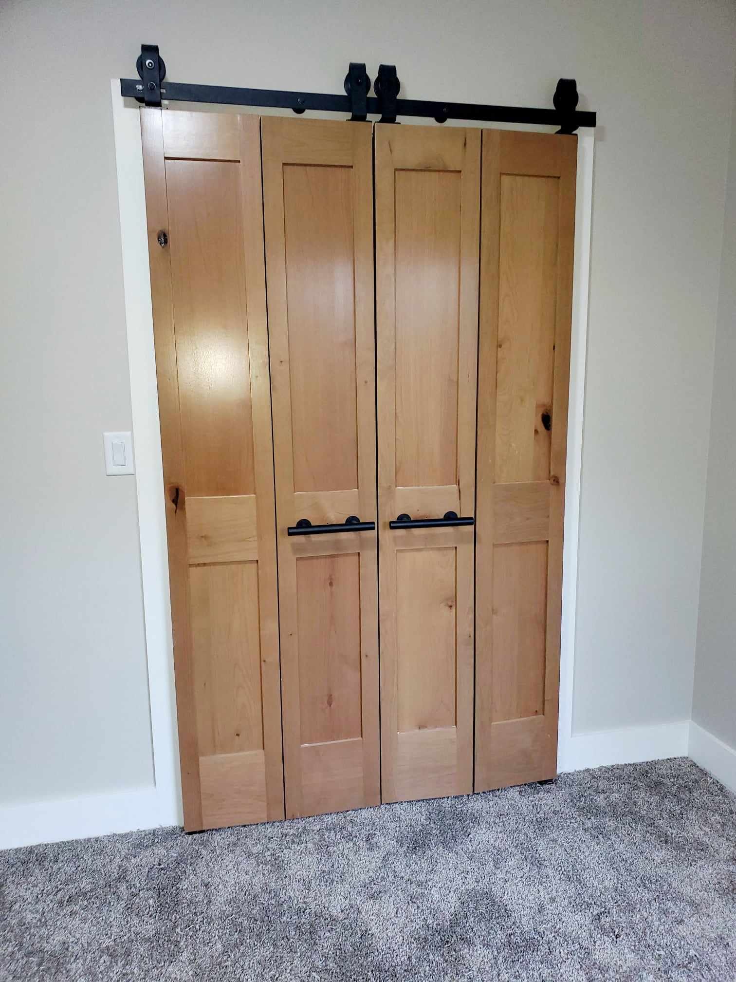 Another unique feature is the installation of bi-fold doors sourced from Menards and the Bi-Folding Sliding Barn Door Hardware Kit purchased from Amazon.