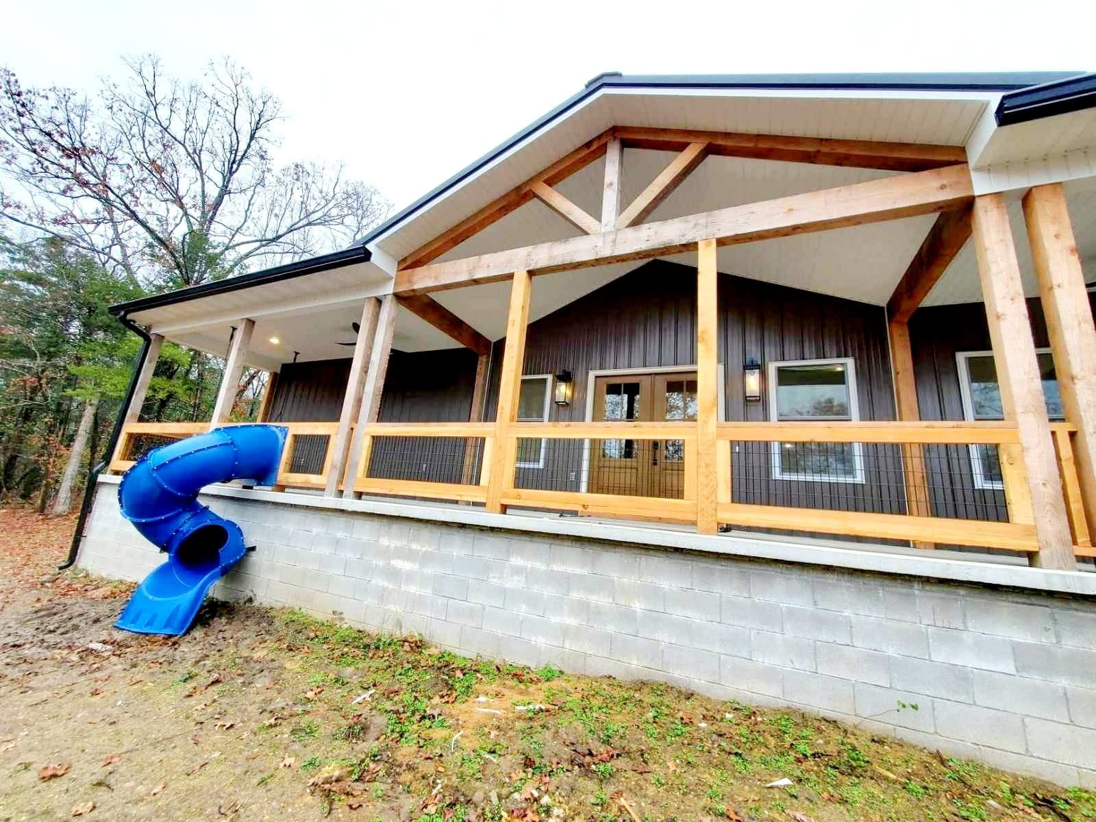 An exceptional and unique feature includes a slide leading from the porch to the ground, adding an element of fun.