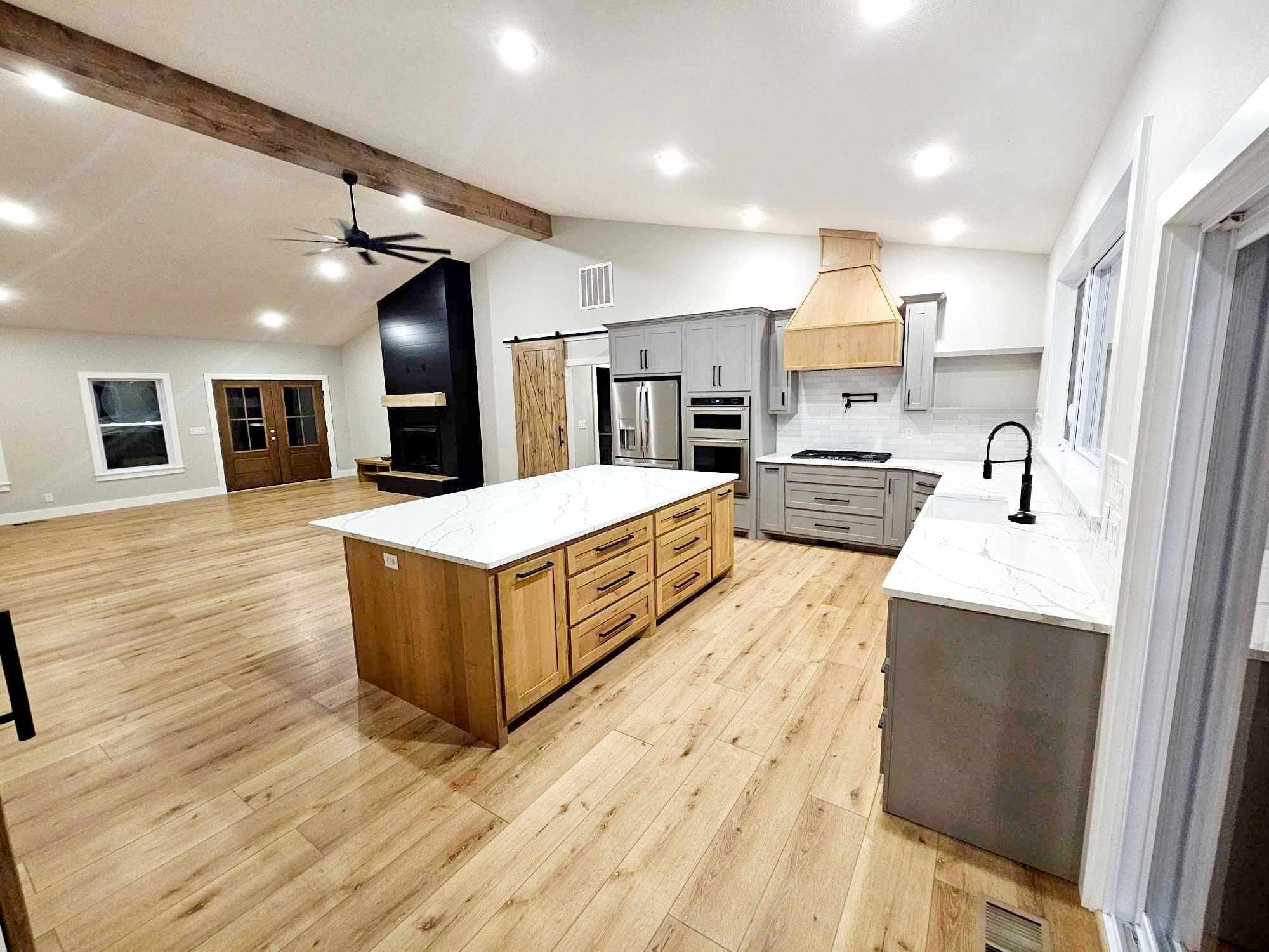 In the barndominium’s kitchen, the cabinets were custom-built by a local craftsman.