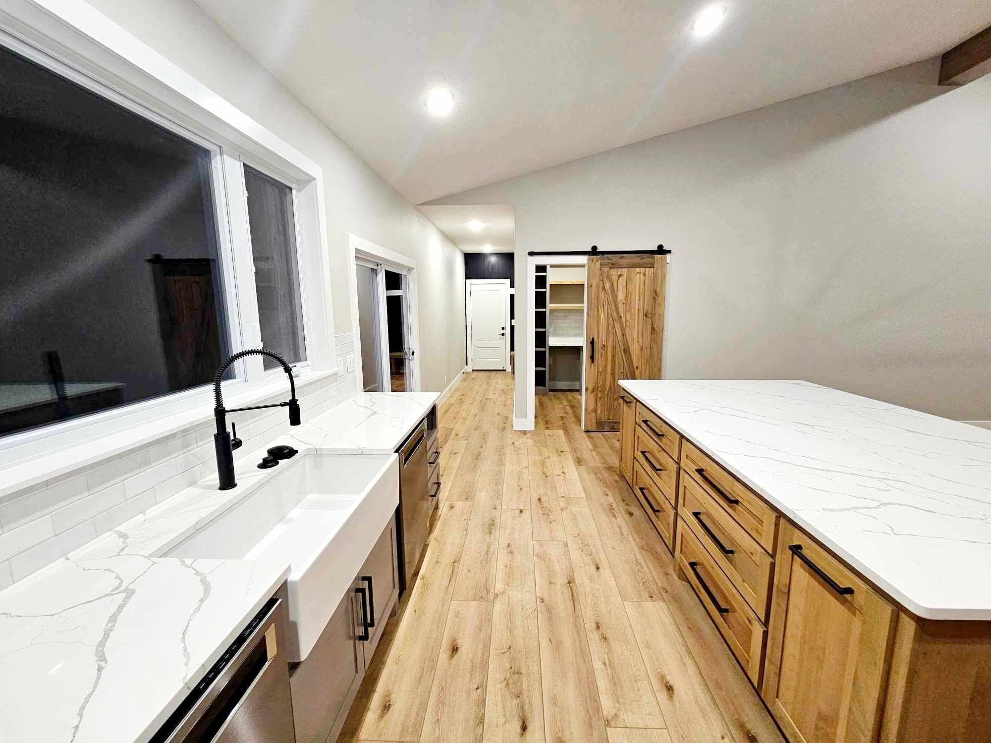 Stainless steel appliances contribute to the modern aesthetic, and a charming farmhouse sink sits beneath a window, providing natural light.