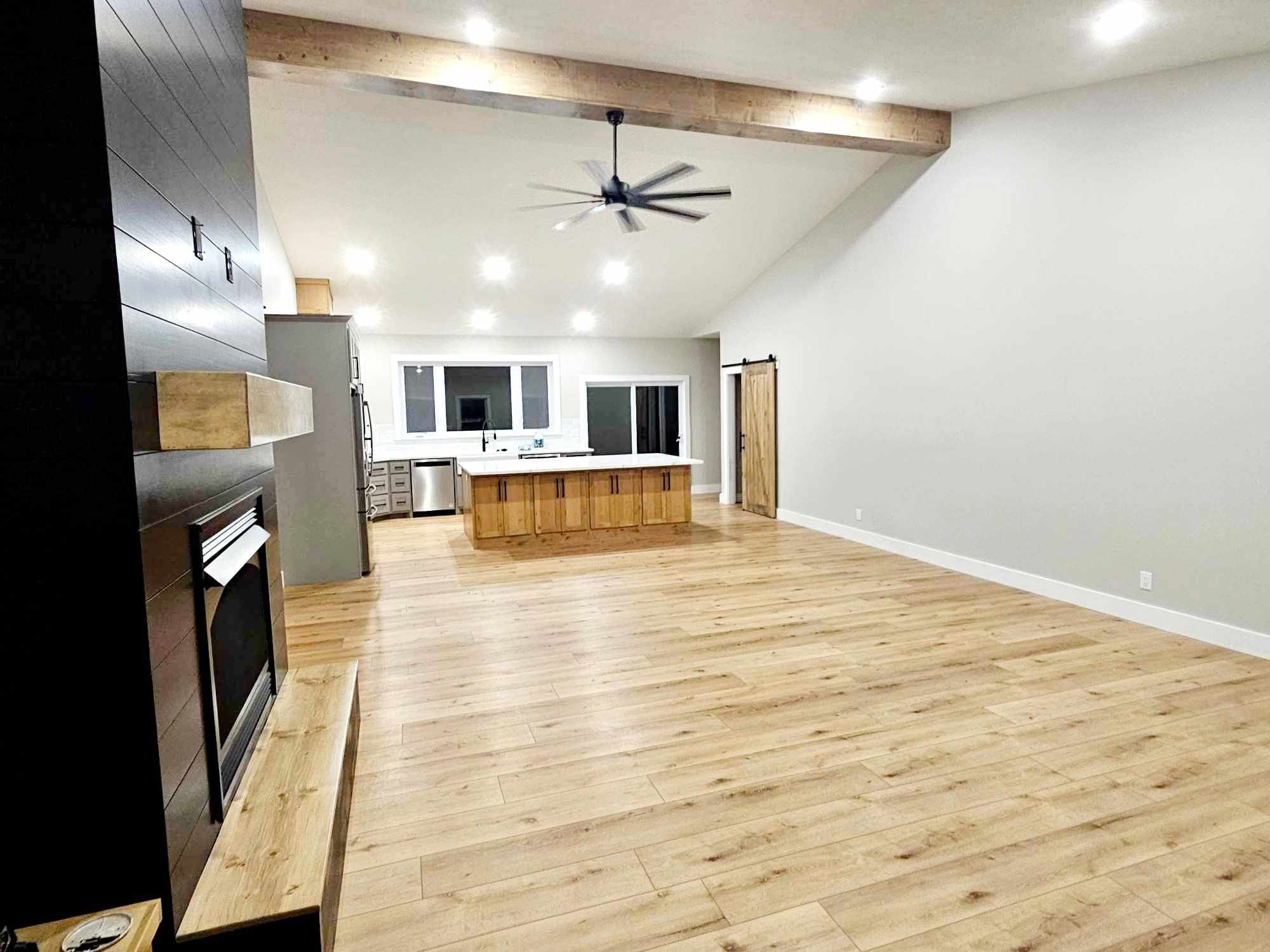In the 40’ x 20’ combined total space of the kitchen and living area, a ceiling fan hangs from an exposed wooden beam at the peak, enhancing air circulation and aesthetic appeal.
