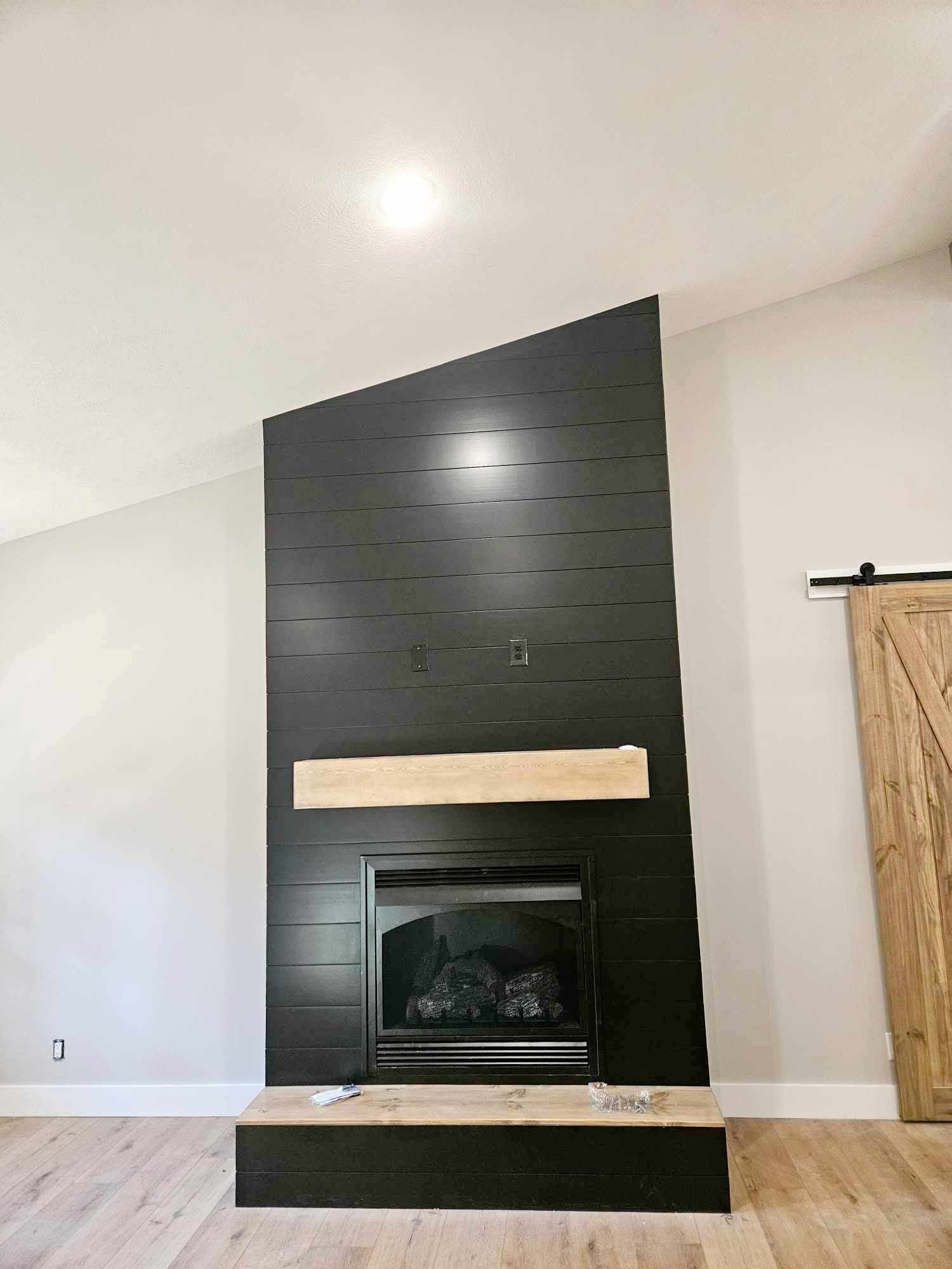 The focal point is a black shiplap-framed fireplace adorned with a natural wood-toned mantle.
