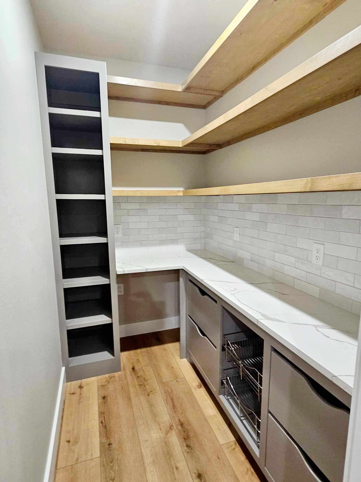 Additionally, the pantry, measuring 8′-4″ x 5′, features open shelving, drawers, and ample countertop space, optimizing storage and functionality.