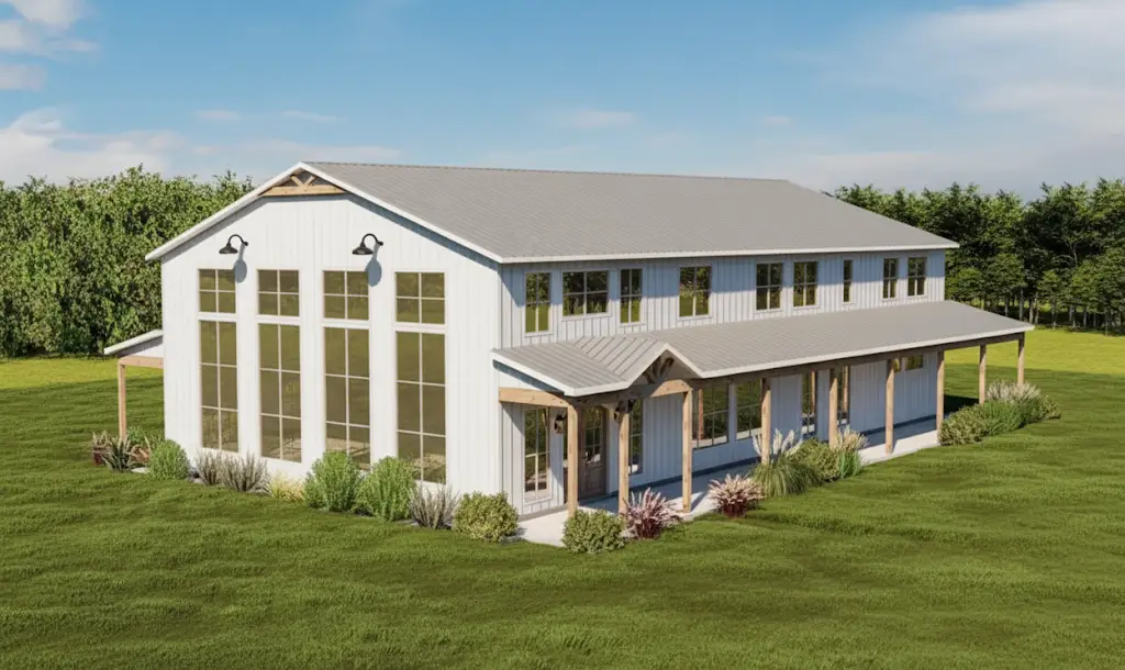 Angle view of the Barndominium Home with Wraparound Porch.