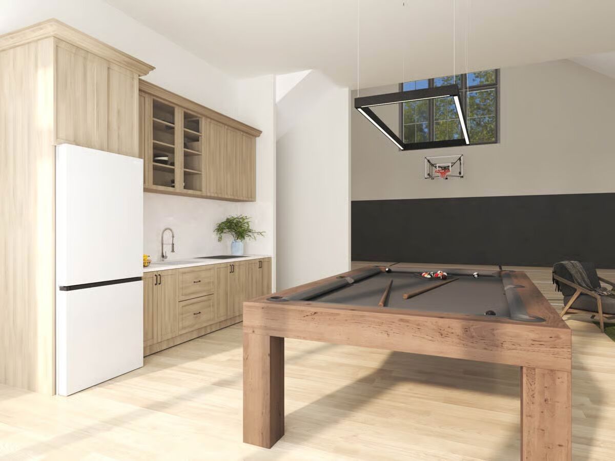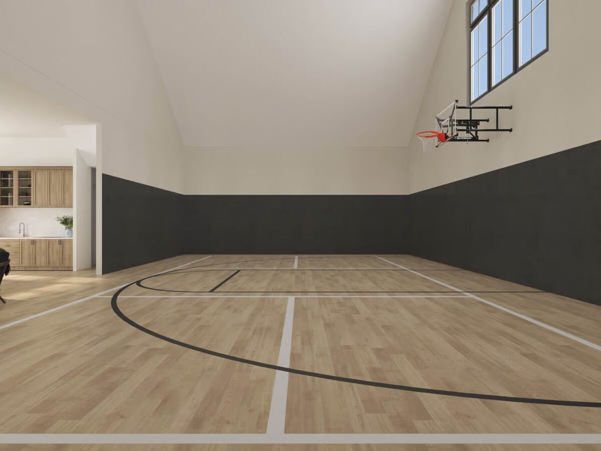 The striking façade, defined by barn-style sliding doors and floor-to-ceiling glass, opens into an impressive indoor sports court crowned by a vaulted ceiling rising from 14’6″ to 30 feet—a showstopping centerpiece for both play and design.